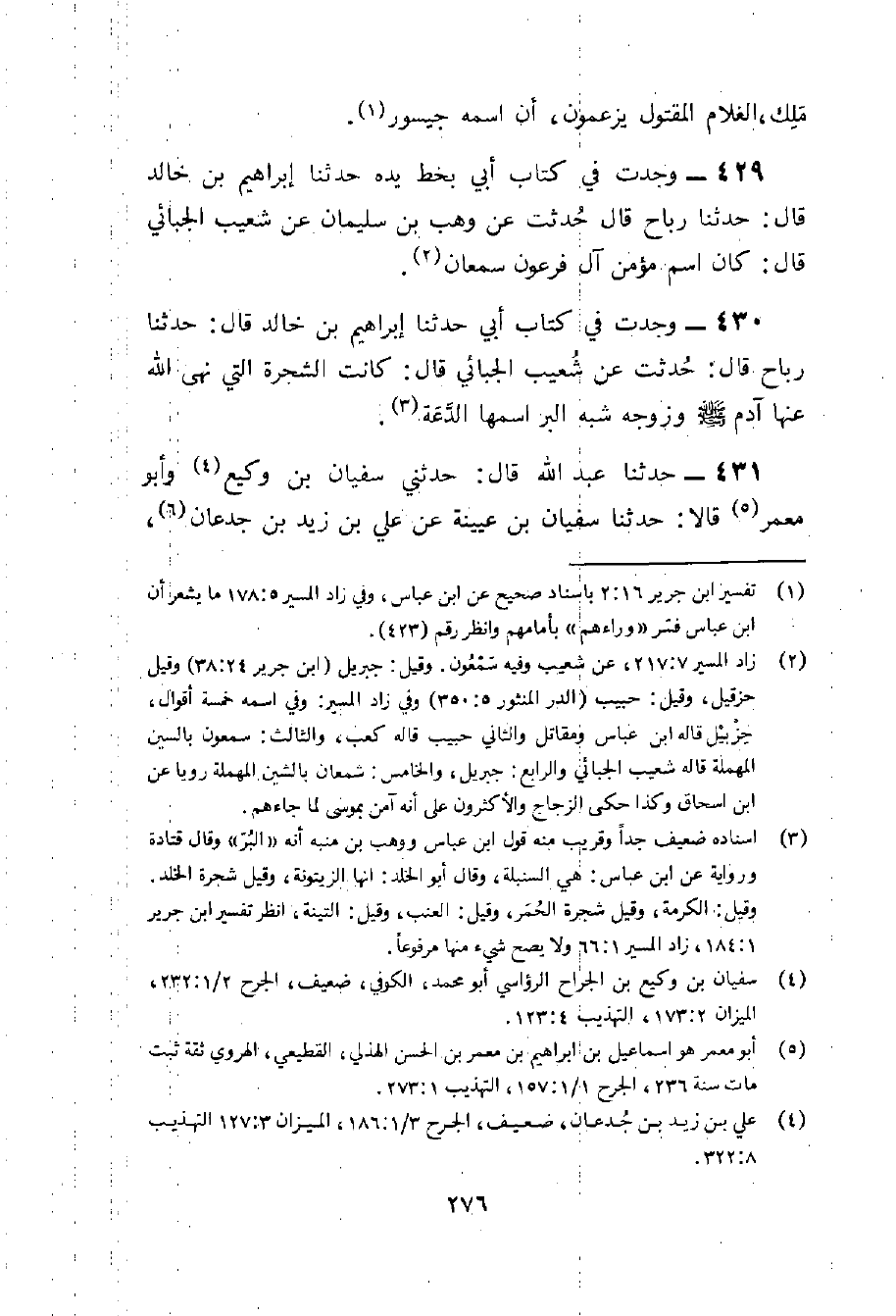 429 - وجدت فِي كتاب أبي بِخَط يَده حَدثنَا إِبْرَاهِيم بن خَالِد قَالَ حَدثنَا رَبَاح قَالَ حدثت عَن وهب بن سُلَيْمَان عَن شُعَيْب الجبائي قَالَ كَانَ اسْم مُؤمن آل فِرْعَوْن سمْعَان