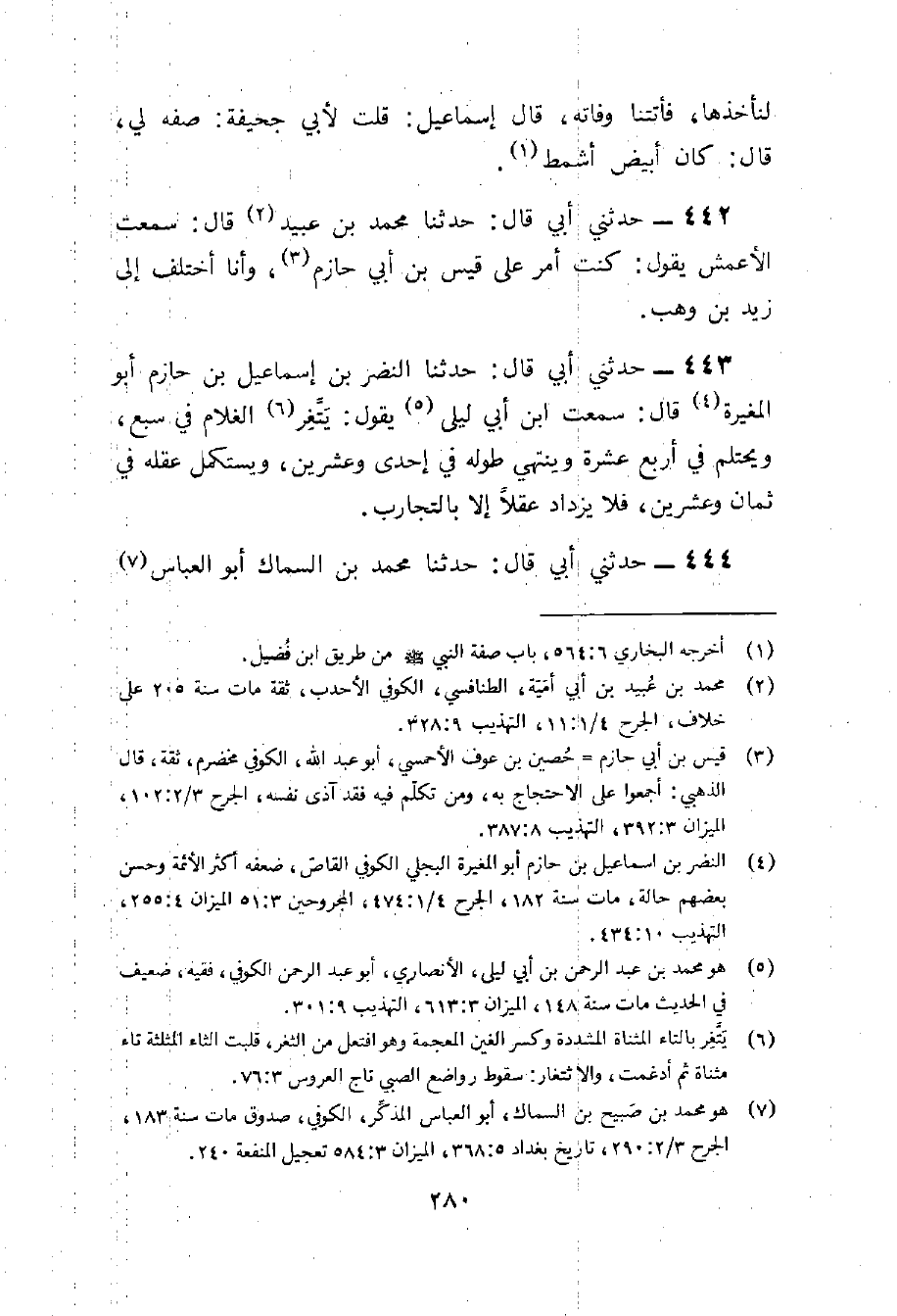 443 - حَدثنِي أبي قَالَ حَدثنَا النَّضر بن إِسْمَاعِيل بن حَازِم أَبُو الْمُغيرَة قَالَ سَمِعت بن أبي ليلى يَقُول يتغر الْغُلَام فِي سبع ويحتلم فِي أَربع عشرَة وَيَنْتَهِي طوله فِي إِحْدَى وَعشْرين ويستكمل عقله فِي ثَمَان وَعشْرين فَلَا يزْدَاد عقلا إِلَّا بالتجارب