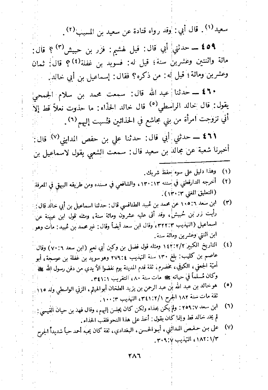 461 - حَدثنِي أبي قَالَ حَدثنَا عَليّ بن حَفْص المدايني قَالَ أخبرنَا شُعْبَة عَن مجَالد بن سعيد قَالَ سَمِعت الشّعبِيّ يَقُول لإسماعيل بن أبي خَالِد مَا لَك تسْأَل عَن هَذَا مَا لَك ضَيْعَة قَالَ أسأَل كَمَا سَأَلت قَالَ الشّعبِيّ وددت أَنِّي لم أسأَل عَن شَيْء من هَذَا