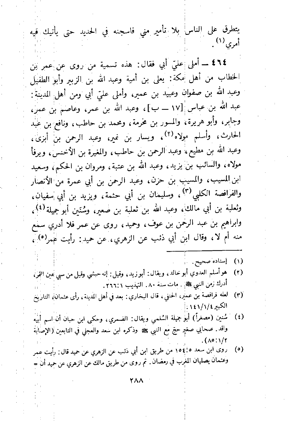 464 - أملي عَليّ أبي فَقَالَ هَذِه تَسْمِيَة من روى عَن عمر بن الْخطاب من أهل مَكَّة يعلى بن أُميَّة وَعبد الله بن الزبير وَأَبُو الطُّفَيْل وَعبد الله بن صَفْوَان وَعبيد بن عُمَيْر وأملى على أبي وَمن أهل الْمَدِينَة عبد الله بن عَبَّاس وَعبد الله بن عمر وَعَاصِم بن عمر وَجَابِر وَأَبُو هُرَيْرَة والمسور بن مخرمَة وَمُحَمّد بن حَاطِب وَنَافِع بن عبد الْحَارِث وَأسلم مَوْلَاهُ ويسار بن نمير وَعبد الرَّحْمَن بن أَبْزَى وَعبد الله بن مُطِيع وَعبد الرَّحْمَن بن حَاطِب والمغيرة بن الْأَخْنَس ويرفا مَوْلَاهُ والسائب بن يزِيد وَعبد الله بن عتبَة ومروان بن الحكم وَسَعِيد بن الْمسيب وَالْمُسَيب بن حزن وَعبد الرَّحْمَن بن أبي عمْرَة من الْأَنْصَار والفرافصة الْكَلْبِيّ وَسليمَان بن أبي حثْمَة وَيزِيد بن أبي سُفْيَان وثعلبة بن أبي مَالك وَعبد الله بن ثَعْلَبَة بن صعير وسنين أَبُو جميلَة وَإِبْرَاهِيم بن عبد الرَّحْمَن بن عَوْف وَحميد روى عَن عمر فَلَا أَدْرِي سمع مِنْهُ أم لَا وَقَالَ بن أبي ذِئْب عَن الزُّهْرِيّ عَن حميد رَأَيْت عمر