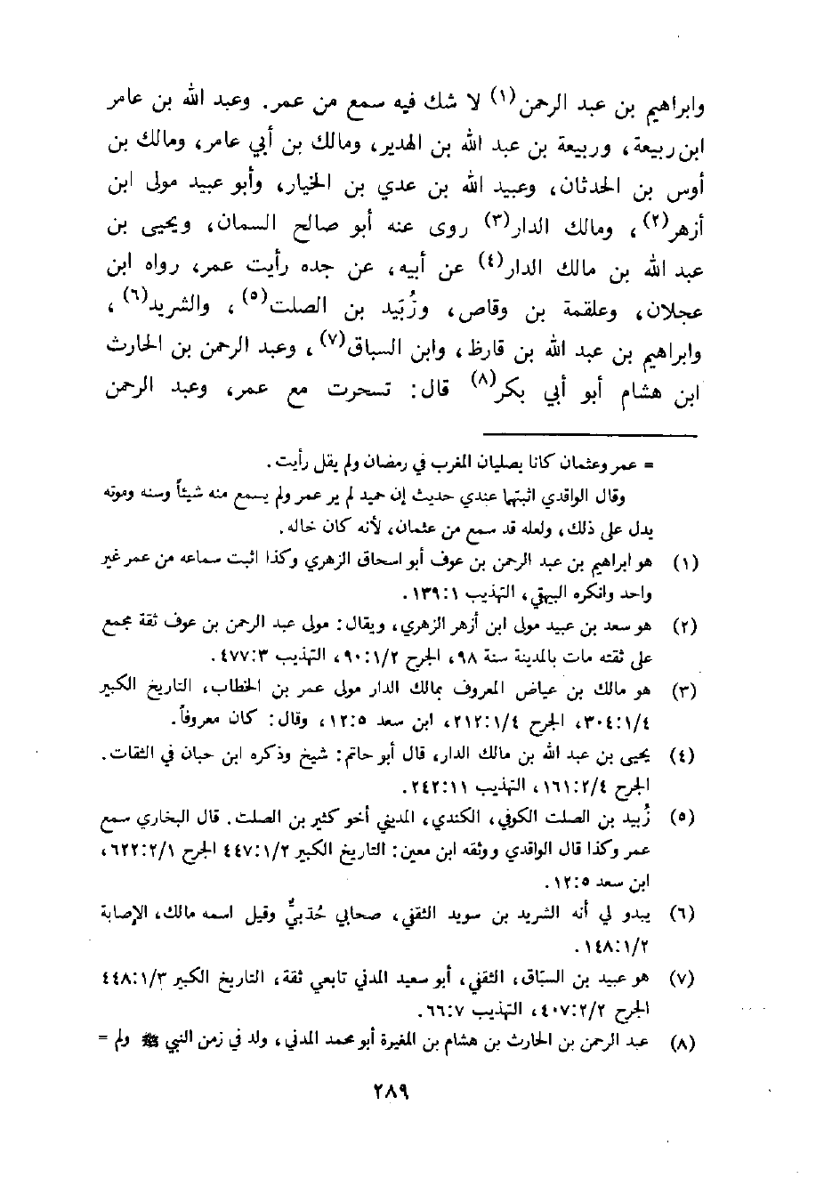 وَإِبْرَاهِيم بن عبد الرَّحْمَن لَا شكّ فِيهِ سمع من عمر وَعبد الله بن عَامر بن ربيعَة وَرَبِيعَة بن عبد الله بن الهدير وَمَالك بن أبي عَامر وَمَالك بن أَوْس بن الْحدثَان وَعبيد الله بن عدي بن الْخِيَار وَأَبُو عبيد مولى بن أَزْهَر وَمَالك الدَّار روى عَنهُ أَبُو صَالح السمان وَيحيى بن عبد الله بن مَالك الدَّار عَن أَبِيه عَن جده رَأَيْت عمر رَوَاهُ بن عجلَان وعلقمة بن وَقاص وزبيد بن الصَّلْت والشريد وَإِبْرَاهِيم بن عبد الله بن قارظ وَابْن السباق وَعبد الرَّحْمَن بن الْحَارِث بن هِشَام أَبُو أبي بكر قَالَ تسحرت مَعَ عمر وَعبد الرَّحْمَن