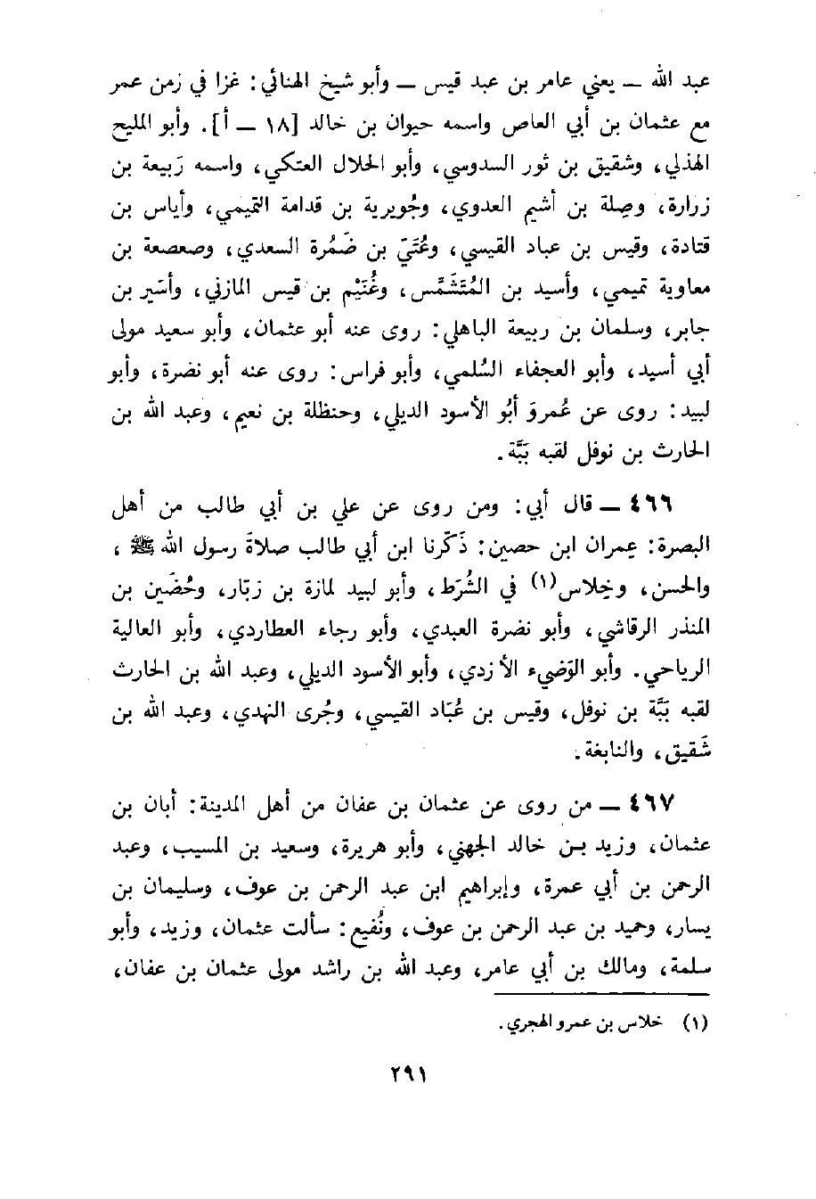 466 - قَالَ أبي وَمن روى عَن عَليّ بن أبي طَالب من أهل الْبَصْرَة عمرَان بن حُصَيْن ذكرنَا بن أبي طَالب صَلَاة رَسُول الله صلى الله عَلَيْهِ وَسلم وَالْحسن وخلاس فِي الشَّرْط وَأَبُو لبيد لمازة بن زبار وحضين بن الْمُنْذر الرقاشِي وَأَبُو نَضرة الْعَبْدي وَأَبُو رَجَاء العطاردي وَأَبُو الْعَالِيَة الريَاحي وَأَبُو الوضيء الْأَزْدِيّ وَأَبُو الْأسود الديلِي وَعبد الله بن الْحَارِث لقبه ببة بن نَوْفَل وَقيس بن عباد الْقَيْسِي وجري النَّهْدِيّ وَعبد الله بن شَقِيق والنابغة