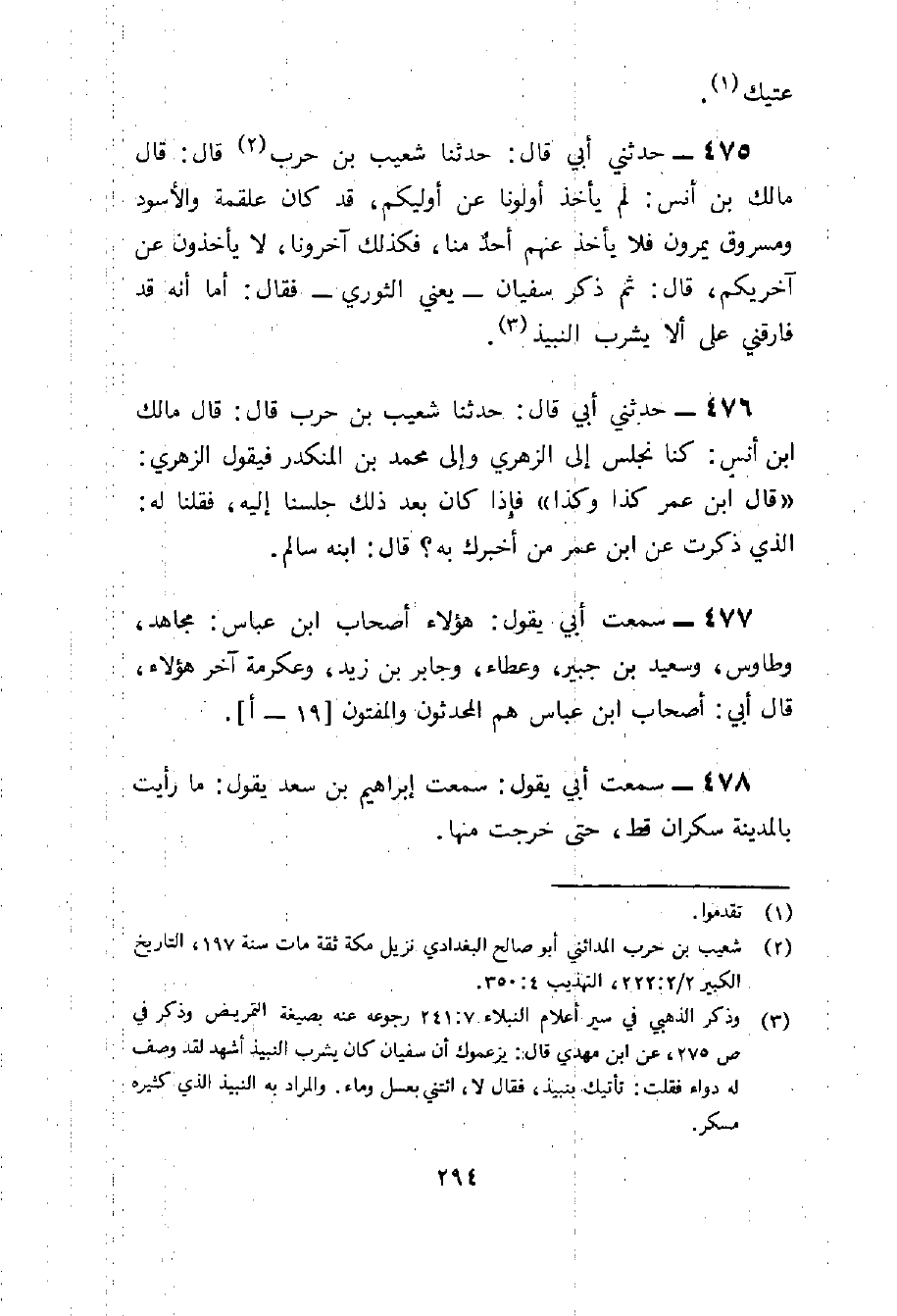 475 - حَدثنِي أبي قَالَ حَدثنَا شُعَيْب بن حَرْب قَالَ قَالَ مَالك بن أنس لم يَأْخُذ أولونا عَن أوليكم قد كَانَ عَلْقَمَة وَالْأسود ومسروق يَمرونَ فَلَا يَأْخُذ عَنْهُم أحد منا فَكَذَلِك آخرونا لَا يَأْخُذُونَ عَن آخريكم قَالَ ثمَّ ذكر سُفْيَان يَعْنِي الثَّوْريّ فَقَالَ أما أَنه قد فارقني على أَلا يشرب النَّبِيذ