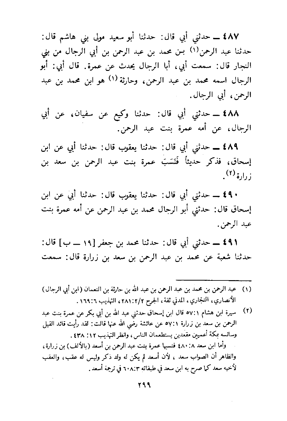 487 - حَدثنِي أبي قَالَ حَدثنَا أَبُو سعيد مولى بني هَاشم قَالَ حَدثنَا عبد الرَّحْمَن بن مُحَمَّد بن عبد الرَّحْمَن بن أبي الرِّجَال من بني النجار قَالَ سَمِعت أبي أَبَا الرِّجَال يحدث عَن عمْرَة قَالَ أبي أَبُو الرِّجَال اسْمه مُحَمَّد بن عبد الرَّحْمَن وحارثة هُوَ بن مُحَمَّد بن عبد الرَّحْمَن أبي الرِّجَال