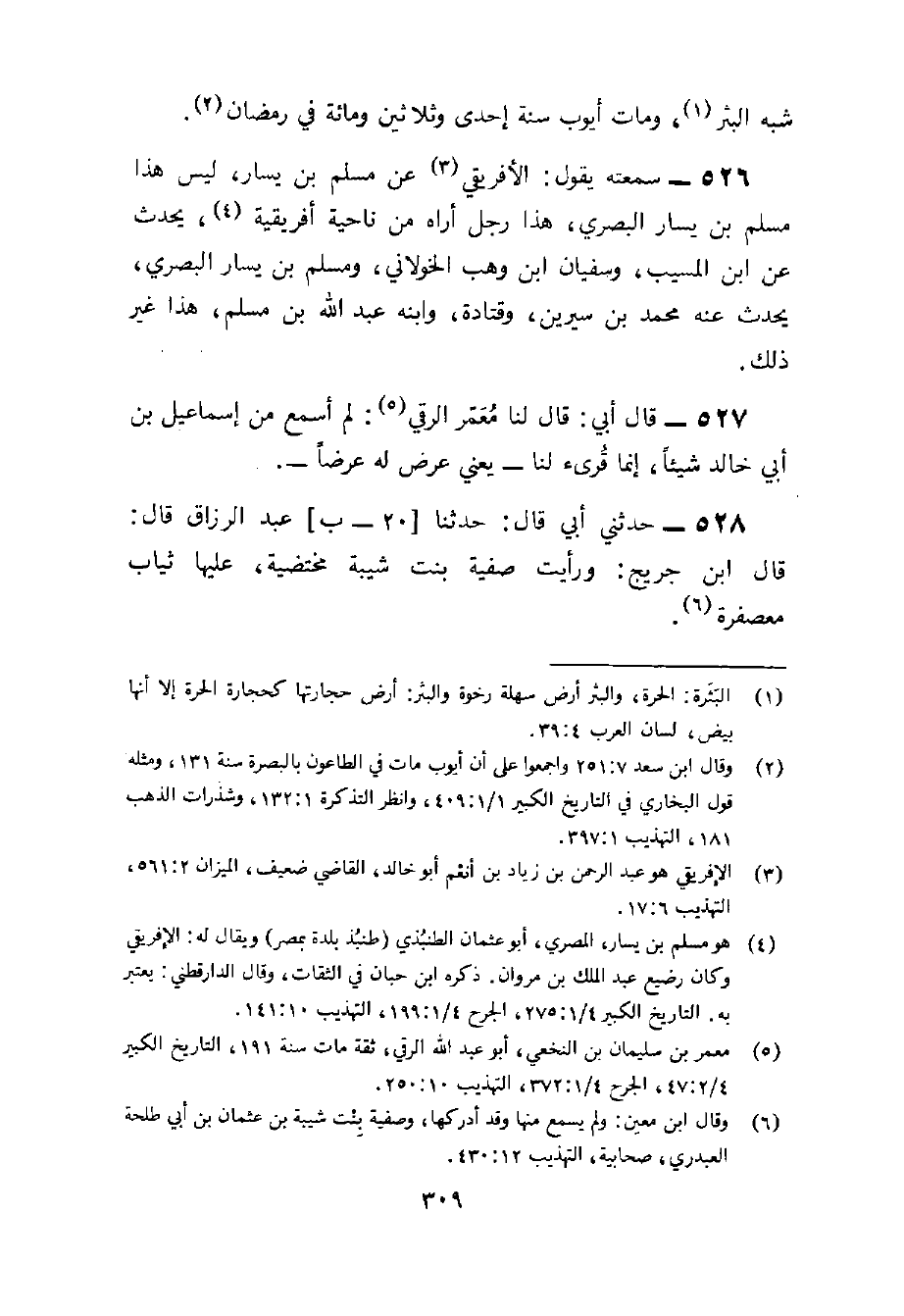 526 - سمعته يَقُول الأفريقي عَن مُسلم بن يسَار لَيْسَ هَذَا مُسلم بن يسَار الْبَصْرِيّ هَذَا رجل أرَاهُ من نَاحيَة أفريقية يحدث عَن بن الْمسيب وسُفْيَان بن وهب الْخَولَانِيّ وَمُسلم بن يسَار الْبَصْرِيّ يحدث عَنهُ مُحَمَّد بن سِيرِين وَقَتَادَة وَابْنه عبد الله بن مُسلم هَذَا غير ذَلِك