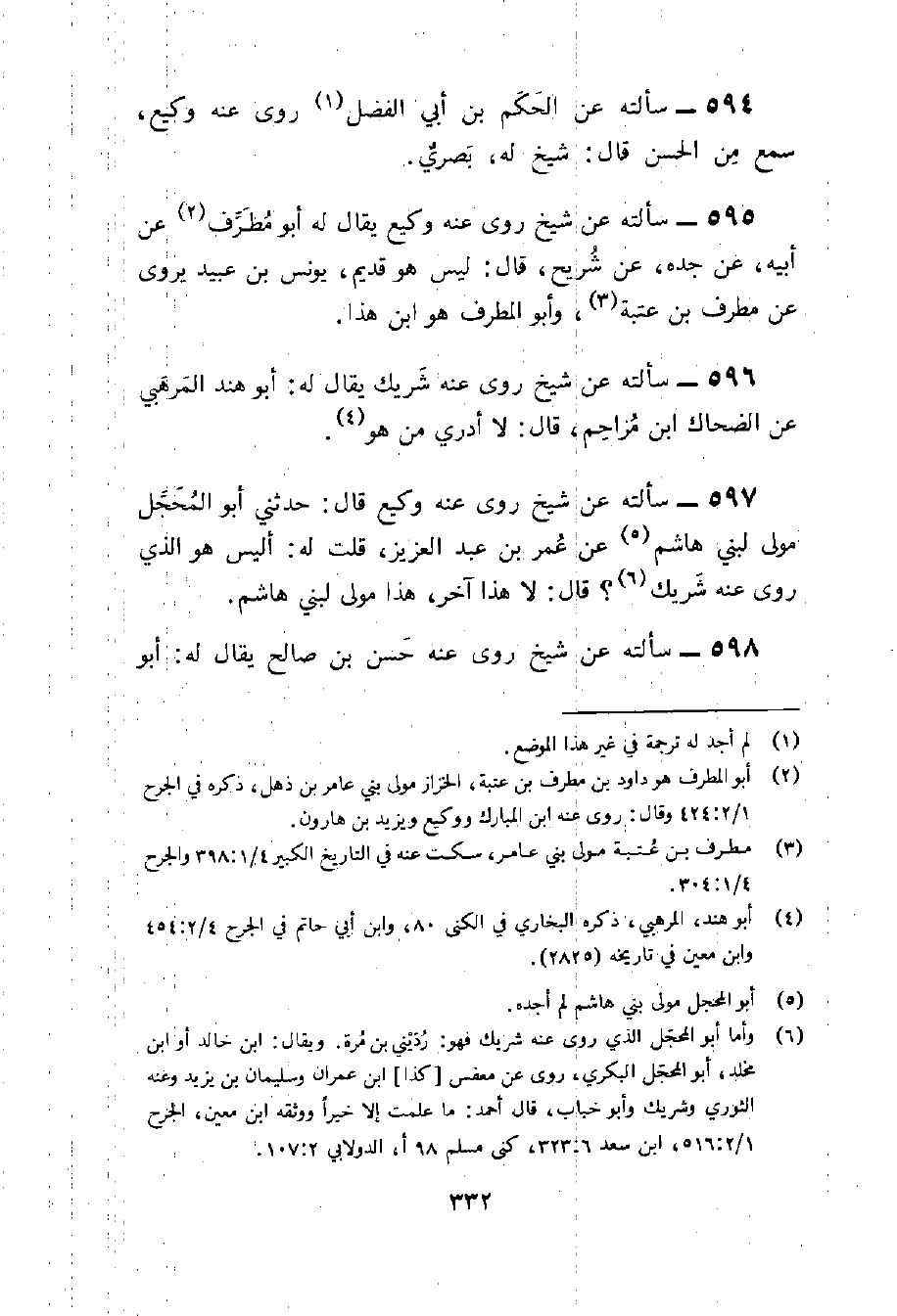 597 - سَأَلته عَن شيخ روى عَنهُ وَكِيع قَالَ حَدثنِي أَبُو المحجل مولى لبني هَاشم عَن عمر بن عبد الْعَزِيز قلت لَهُ أَلَيْسَ هُوَ الَّذِي روى عَنهُ شريك قَالَ لَا هَذَا آخر هَذَا مولى لبني هَاشم