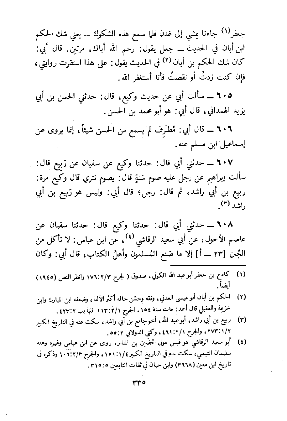608 - حَدَّثَنِي أَبِي قَالَ حَدثنَا وَكِيع قَالَ حَدثنَا سُفْيَان عَنْ عَاصِمٍ الأَحْوَلِ عَنْ أَبِي سعيد الرقاشِي عَن بن عَبَّاسٍ لَا تَأْكُلْ مِنَ الْجُبْنِ إِلا مَا صَنَعَ الْمُسْلِمُونَ وَأَهْلُ الْكِتَابِ قَالَ أَبِي وَكَانَ فِي كِتَابِنَا عَنْ سُلَيْمَانَ التَّيْمِيِّ فَقَالَ وَكِيعٌ عَاصِمٌ الأَحْوَلُ وَهُوَ الصَّوَابُ وَكُنَّا نسخناه من كتاب بن أَبِي شَيْبَةَ