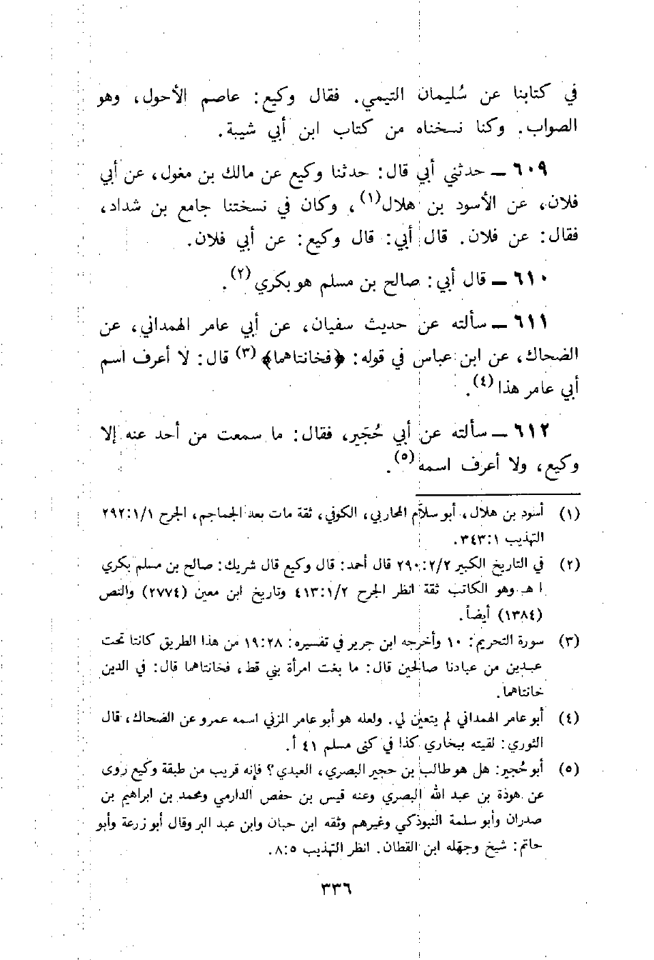 609 - حَدَّثَنِي أَبِي قَالَ حَدَّثَنَا وَكِيعٌ عَن مَالك بن مغول عَن أبي فلَان عَن الْأسود بن هِلَال وَكَانَ فِي نسختنا جَامع بن شَدَّاد فَقَالَ عَن فلَان قَالَ أبي قَالَ وَكِيع عَن أبي فلَان