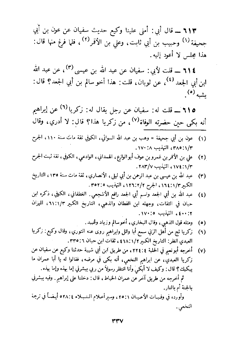 613 - قَالَ أبي أمْلى علينا وَكِيع حَدِيث سُفْيَان عَن عون بن أبي جُحَيْفَة وحبِيب بن أبي ثَابت وَعلي بن الْأَقْمَر فَلَمَّا فرغ مِنْهَا قَالَ هَذَا مجْلِس لَا أَعُود إِلَيْهِ