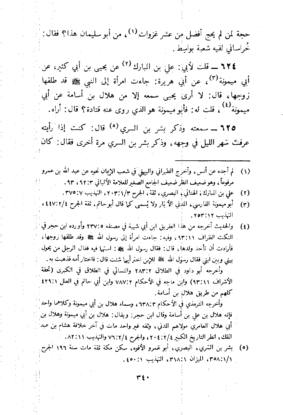 625 - سمعته وَذكر بشر بن السّري قَالَ كنت إِذا رَأَيْته عرفت سهر اللَّيْل فِي وَجهه وَذكر بشر بن السّري مرّة أُخْرَى فَقَالَ كَانَ فِي الحَدِيث متفهما عجبا وَذكر عمرَان بن حدير فَقَالَ لم يرو عَنهُ الثَّوْريّ وَلَا هشيم شَيْئا وَذكر يُونُس بن الْحَارِث الَّذِي يروي عَن أبي بردة فَقَالَ أَحَادِيثه مضطربة والنعمان بن قيس الَّذِي يروي عَن عُبَيْدَة صَالح الحَدِيث الْجَعْد بن ذكْوَان مَا أعلم إِلَّا خيرا قلت لَهُ هُوَ أحب إِلَيْك أَو النُّعْمَان بن قيس قَالَ لَا أَدْرِي