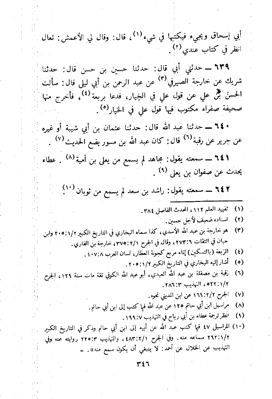 639 - حَدثنِي أبي قَالَ حَدثنَا حُسَيْن بن حسن قَالَ حَدثنَا شريك عَن خَارِجَة الصَّيْرَفِي عَن عبد الرَّحْمَن بن أبي ليلى قَالَ سَأَلت الْحسن بن عَليّ عَن قَول عَليّ فِي الْخِيَار فَدَعَا بربعة فَأخْرج مِنْهَا صحيفَة صفراء مَكْتُوب فِيهَا قَول عَليّ فِي الْخِيَار