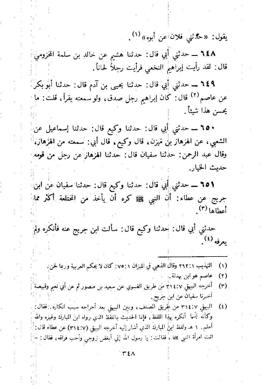 648 - حَدثنِي أبي قَالَ حَدثنَا هشيم عَن خَالِد بن سَلمَة المَخْزُومِي قَالَ لقد رَأَيْت إِبْرَاهِيم النَّخعِيّ فَرَأَيْت رجلا لحانا
