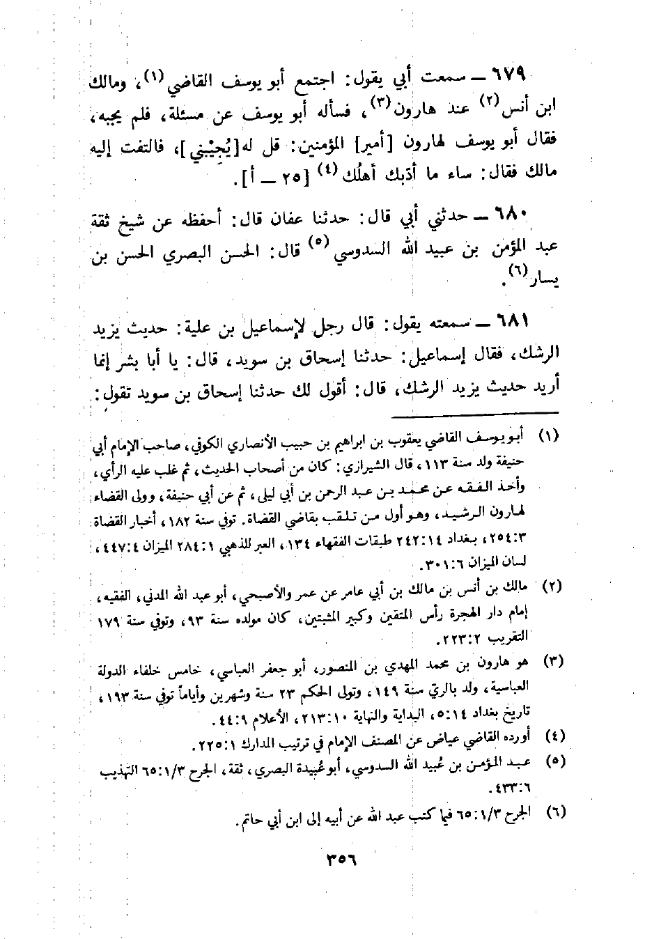 679 - سَمِعت أبي يَقُول اجْتمع أَبُو يُوسُف القَاضِي وَمَالك بن أنس عِنْد هَارُون فَسَأَلَهُ أَبُو يُوسُف عَن مَسْأَلَة فَلم يجبهُ فَقَالَ أَبُو يُوسُف لهارون أَمِير الْمُؤمنِينَ قل لَهُ يجيبني فَالْتَفت إِلَيْهِ مَالك فَقَالَ سَاءَ مَا أدبك أهلك
