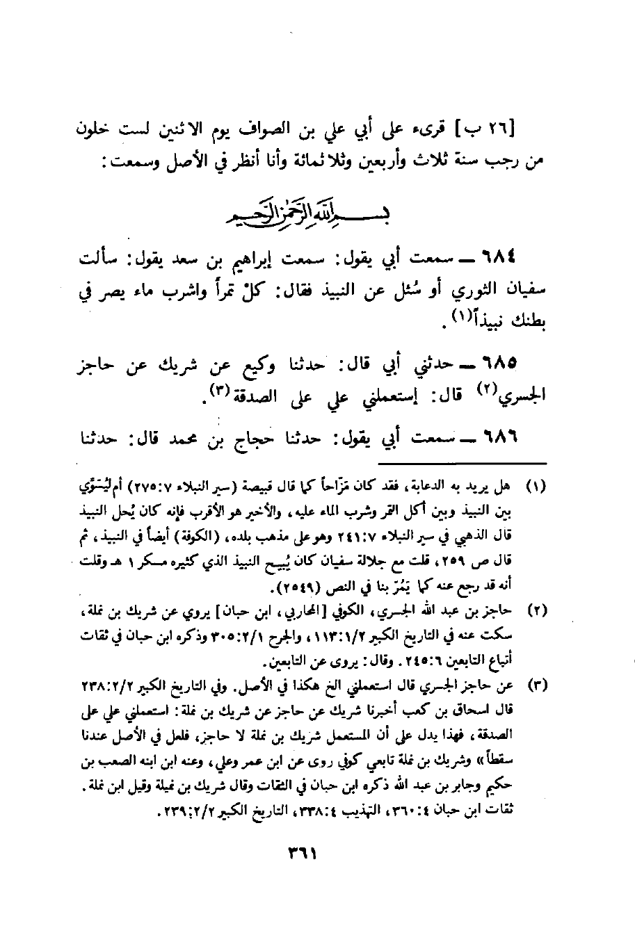 قرئَ على أبي عَليّ بن الصَّواف يَوْم الْإِثْنَيْنِ لست خلون من رَجَب سنة ثَلَاث وَأَرْبَعين وثلاثمائة وَأَنا أنظر فِي الأَصْل وَسمعت بِسم اللَّه الرَّحْمَن الرَّحِيم