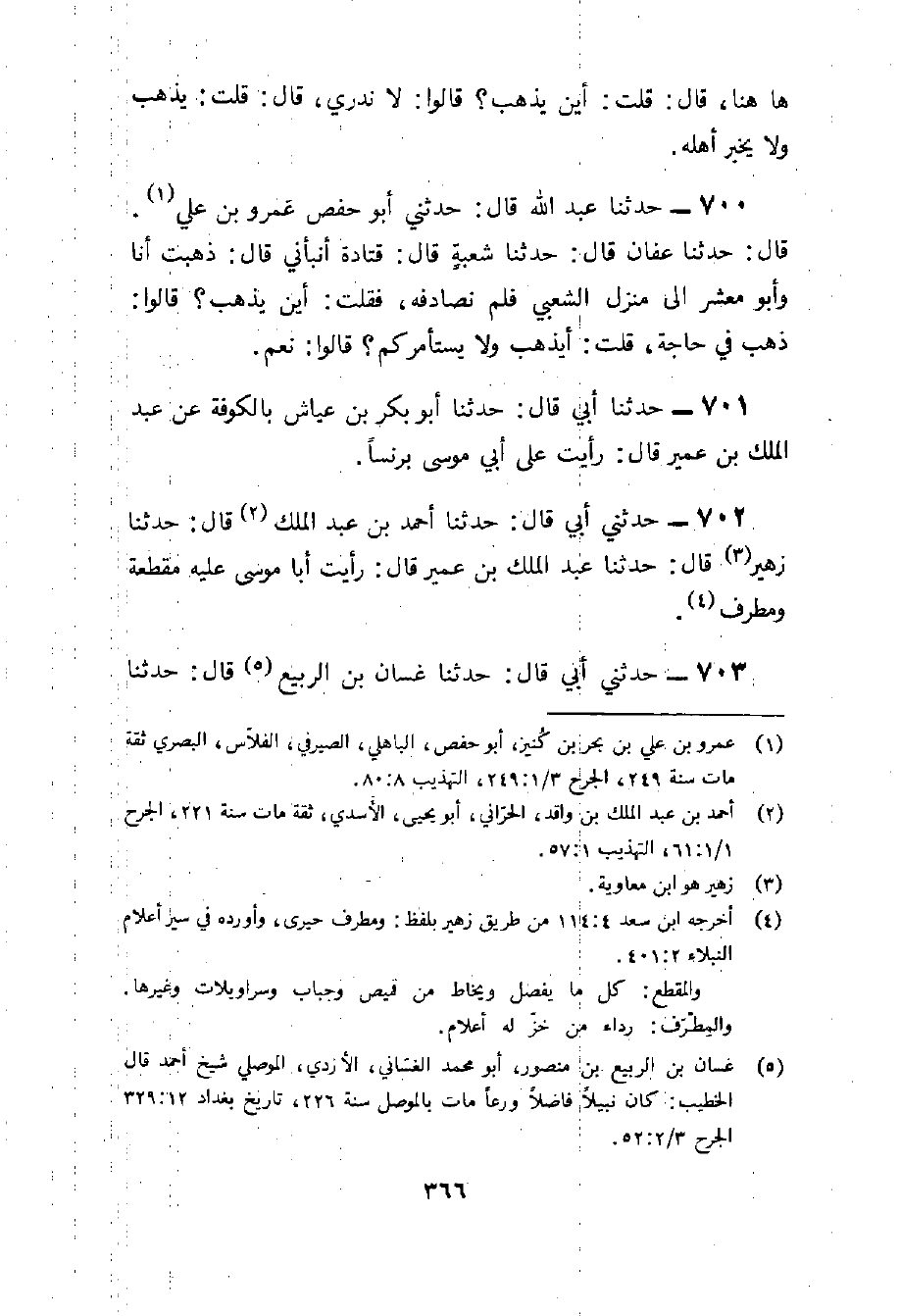 700 - حَدثنَا عبد الله قَالَ حَدثنِي أَبُو حَفْص عَمْرو بن عَليّ قَالَ حَدثنَا عَفَّان قَالَ حَدثنَا شُعْبَة قَالَ قَتَادَة أنبأني قَالَ ذهبت أَنا وَأَبُو معشر إِلَى منزل الشّعبِيّ فَلم نصادفه فَقلت أَيْن يذهب قَالُوا ذهب فِي حَاجَة قلت أيذهب وَلَا يستأمركم قَالُوا نعم