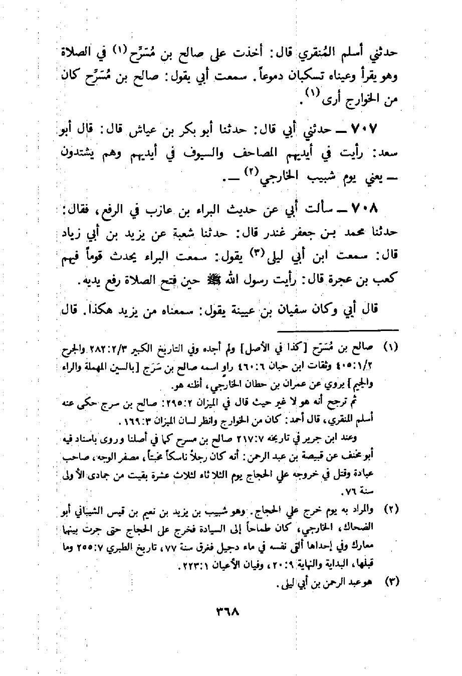 707 - حَدثنِي أبي قَالَ حَدثنَا أَبُو بكر بن عَيَّاش قَالَ قَالَ أَبُو سعد رَأَيْت فِي أَيْديهم الْمَصَاحِف وَالسُّيُوف فِي أَيْديهم وهم يَشْتَدُّونَ يَعْنِي يَوْم شبيب الْخَارِجِي