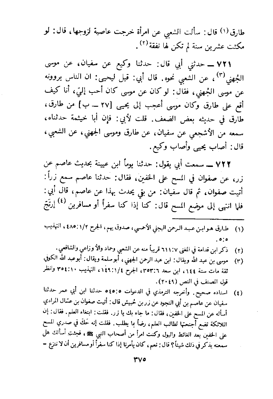 721 - حَدثنِي أبي قَالَ حَدَّثَنَا وَكِيعٌ عَنْ سُفْيَانَ عَن مُوسَى الْجُهَنِيّ عَن الشّعبِيّ نَحوه قَالَ أبي قيل ليحيى إِن النَّاس يَرْوُونَهُ عَن مُوسَى الْجُهَنِيّ فَقَالَ لَو كَانَ عَن مُوسَى كَانَ أحب إِلَيّ أَنا كَيفَ أقع على طَارق وَكَانَ مُوسَى أعجب إِلَى يحيى من طَارق طَارق فِي حَدِيثه بعض الضعْف قلت لأبي فَإِن أَبَا خَيْثَمَة حدّثنَاهُ سَمعه من الْأَشْجَعِيّ عَن سُفْيَان عَن طَارق ومُوسَى الْجُهَنِيّ عَن الشّعبِيّ قَالَ أصَاب يحيى وَأصَاب وَكِيع