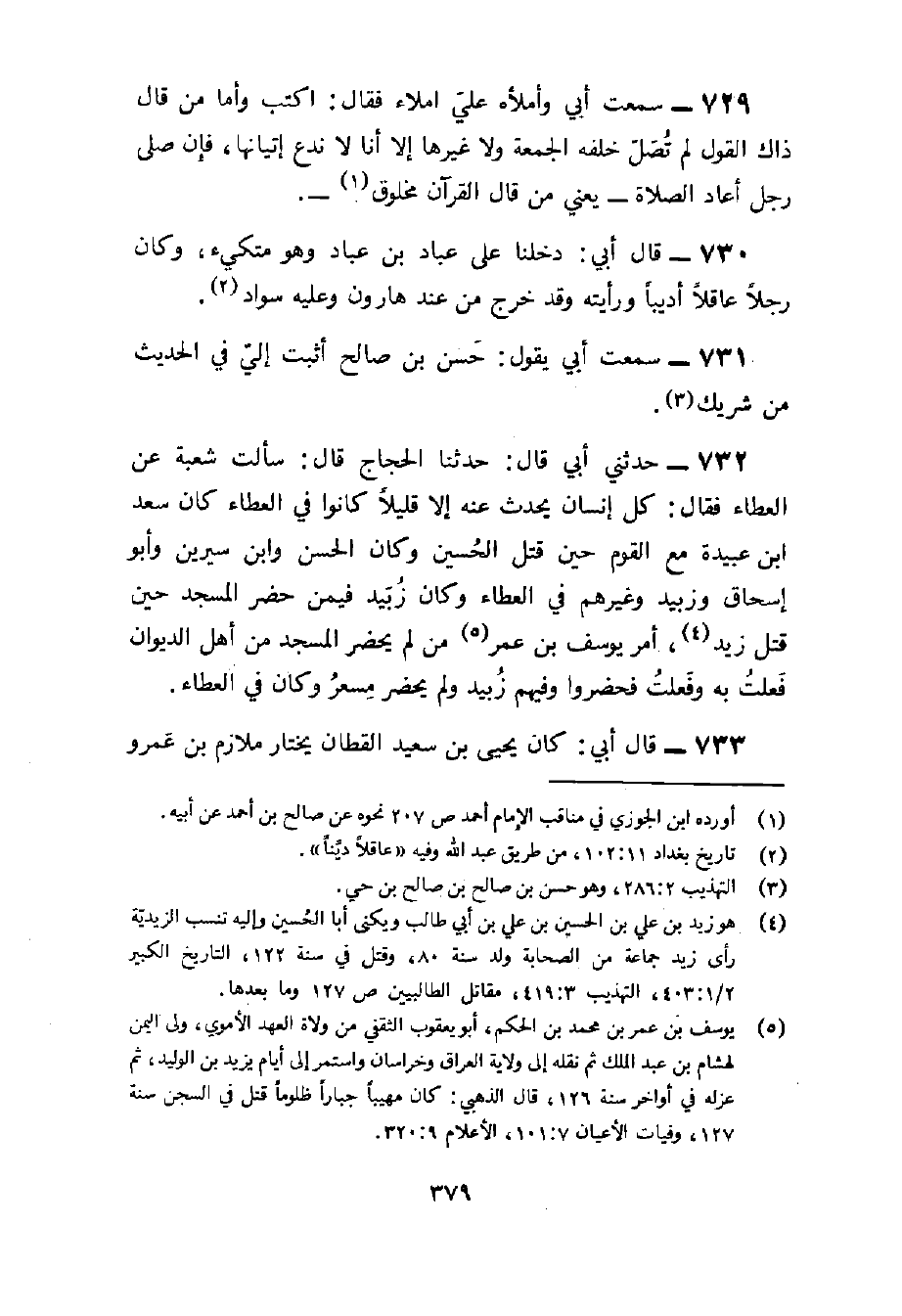 732 - حَدثنِي أبي قَالَ حَدثنَا الْحجَّاج قَالَ سَأَلت شُعْبَة عَن الْعَطاء فَقَالَ كل إِنْسَان يحدث عَنهُ إِلَّا قَلِيلا كَانُوا فِي الْعَطاء كَانَ سعد بن عُبَيْدَة مَعَ الْقَوْم حِين قتل الْحُسَيْن وَكَانَ الْحسن وَابْن سِيرِين وَأَبُو إِسْحَاق وزبيد وَغَيرهم فِي الْعَطاء وَكَانَ زبيد فِيمَن حضر الْمَسْجِد حِين قتل زيد أَمر يُوسُف بن عمر من لم يحضر الْمَسْجِد من أهل الدِّيوَان فعلت بِهِ وَفعلت فَحَضَرُوا وَفِيهِمْ زبيد وَلم يحضر مسعر وَكَانَ فِي الْعَطاء