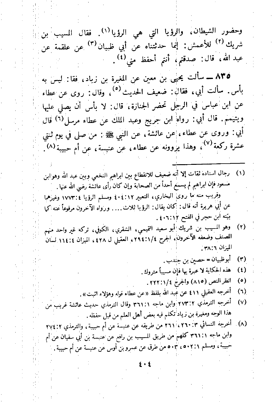 835 - سَأَلت يحيى بن معِين عَن الْمُغِيرَةِ بْنِ زِيَادٍ فَقَالَ لَيْسَ بِهِ بَأْسٌ سَأَلْتُ أَبِي فَقَالَ ضَعِيفُ الْحَدِيثِ وَقَالَ رَوَى عَنْ عَطاء عَن بن عَبَّاس فِي الرجل تحضر الْجِنَازَةُ قَالَ لَا بَأْسَ أَنْ يُصَلِّي عَلَيْهَا وَيَتَيَمَّمَ قَالَ أَبِي رَوَاهُ بن جُرَيْجٍ وَعَبْدُ الْمَلِكِ عَنْ عَطَاءٍ مُرْسل قَالَ أَبِي وَرُوِيَ عَنْ عَطَاءٍ عَن عَائِشَة عَن النَّبِي صلى اللَّهُ عَلَيْهِ وَسَلَّمَ مَنْ صَلَّى فِي يَوْمٍ ثِنْتَيْ عَشَرَةَ رَكْعَةً وَهَذَا يَرْوُونَهُ عَنْ عَطَاءٍ عَنْ عَنْبَسَةَ عَنْ أُمِّ حَبِيبَةَ مَنْ صَلَّى فِي يَوْمٍ ثِنْتَيْ عَشَرَةَ رَكْعَةً بُنِيَ لَهُ بَيْتٌ فِي الْجَنَّةِ وَرُوِيَ عَنْ عَطَاءٍ عَنْ عَائِشَةَ أَنَّ النَّبِيَّ صَلَّى اللَّهُ عَلَيْهِ وَسَلَّمَ كَانَ إِذَا سَافَر قَصَرَ وَأَتَمَّ وَالنَّاسُ يَرْوُونَهُ عَنْ عَطاء مُرْسَلٌ
