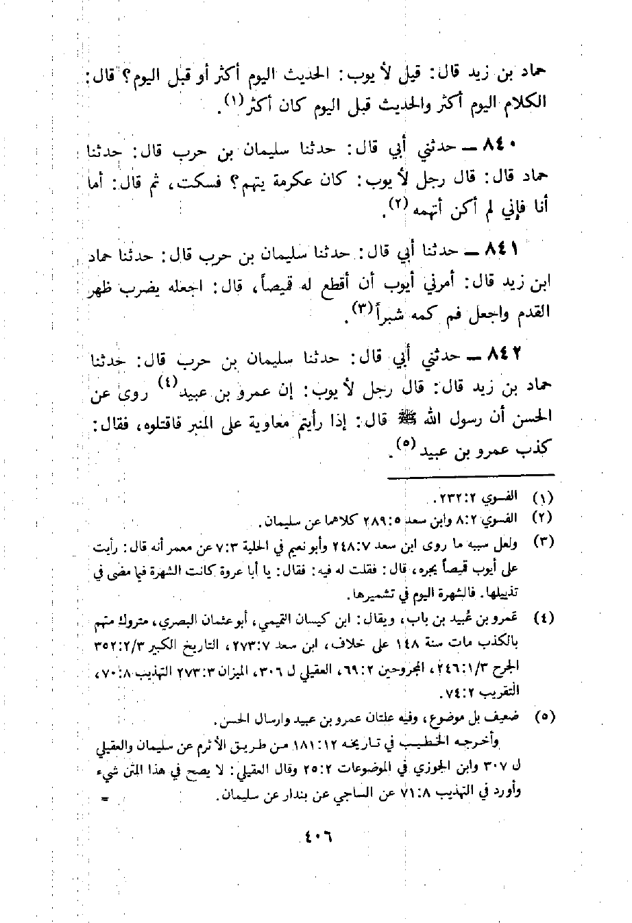842 - حَدثنِي أبي قَالَ حَدثنَا سُلَيْمَان بن حَرْب قَالَ حَدثنَا حَمَّاد بْنُ زَيْدٍ قَالَ قَالَ رَجُلٌ لِأَيُّوبَ إِنَّ عَمْرَو بْنَ عُبَيْدٍ رَوَى عَنِ الْحَسَنِ أَنّ رَسُولَ اللَّهِ صَلَّى اللَّهُ عَلَيْهِ وَسَلَّمَ قَالَ إِذَا رَأَيْتُمْ مُعَاوِيَةَ عَلَى الْمِنْبَرِ فَاقْتُلُوهُ فَقَالَ كَذَبَ عَمْرُو بْنُ عُبَيْدٍ