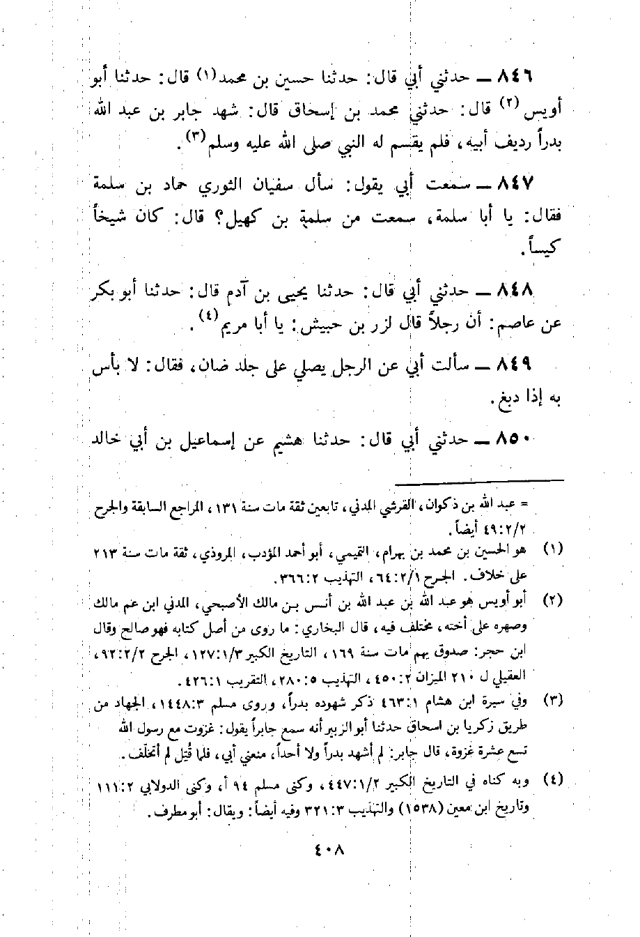 846 - حَدثنِي أبي قَالَ حَدثنَا حُسَيْن بن مُحَمَّد قَالَ حَدثنَا أَبُو أويس قَالَ حَدثنِي مُحَمَّد بن إِسْحَاق قَالَ شهد جَابر بن عبد الله بَدْرًا رَدِيف أَبِيه فَلم يقسم لَهُ النَّبِي صلى الله عَلَيْهِ وَسلم