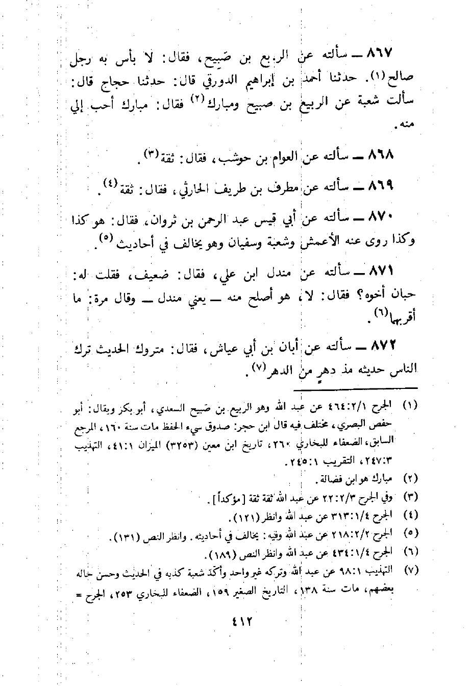 867 - سَأَلته عَن الرّبيع بن صبيح فَقَالَ لَا بَأْس بِهِ رجل صَالح حَدثنَا أَحْمد بن إِبْرَاهِيم الدَّوْرَقِي قَالَ دثنا حجاج قَالَ سَأَلت شُعْبَة عَن الرّبيع بن صبيح ومبارك فَقَالَ مبارك أحب إِلَيّ مِنْهُ