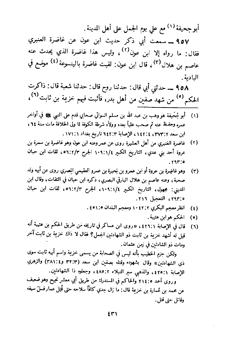 958 - حَدثنِي أبي قَالَ حَدثنَا روح قَالَ حَدثنَا شُعْبَة قَالَ ذاكرت الحكم من شهد صفّين من أهل بدر فَأثْبت فيهم خُزَيْمَة بن ثَابت وَكَانَ شُعْبَة يُنكر أَن يكون أَبُو الْهَيْثَم بن التيهَان شهد صفّين