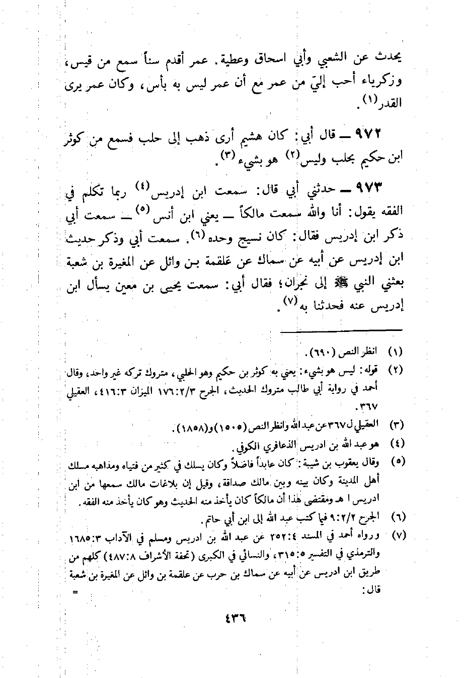 973 - حَدَّثَنِي أَبِي قَالَ سَمِعت بن إِدْرِيسَ رُبَّمَا تَكَلَّمَ فِي الْفِقْهِ يَقُولُ أَنَا وَاللَّهِ سَمِعْتُ مَالِكًا يَعْنِي بن أنس سَمِعت أبي ذكر بن إِدْرِيسَ فَقَالَ كَانَ نَسِيجٌ وَحْدَهُ سَمِعت أبي وَذكر حَدِيث بن إِدْرِيسَ عَنْ أَبِيهِ عَنْ سِمَاكٍ عَنْ عَلْقَمَةَ بْنِ وَائِلٍ عَنِ الْمُغِيرَةِ بْنِ شُعْبَةَ بَعَثَنِي النَّبِيُّ صَلَّى اللَّهُ عَلَيْهِ وَسَلَّمَ إِلَى نَجْرَانَ فَقَالَ أَبِي سَمِعْتُ يَحْيَى بن معِين يسْأَل بن إِدْرِيسَ عَنْهُ فَحَدَّثَنَا بِهِ