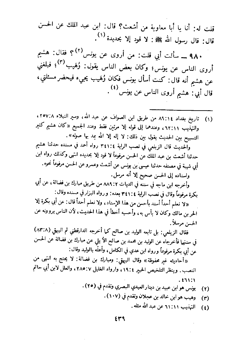 980 - سَأَلت أبي قلت من أروى عَن يُونُس فَقَالَ هشيم أروى النَّاس عَن يُونُس وَكَانَ بعض النَّاس يَقُول وهيب فبلغني عَن هشيم أَنه قَالَ كنت أسأَل يُونُس فَكَانَ وهيب يَجِيء فيحضر مسئلتي قَالَ أبي هشيم أروى النَّاس عَن يُونُس