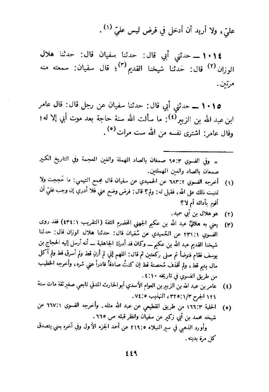 1015 - حَدثنِي أبي قَالَ حَدثنَا سُفْيَان عَن رجل قَالَ قَالَ عَامر بن عبد الله بن الزبير مَا سَأَلت الله سنة حَاجَة بعد موت أبي إِلَّا لَهُ وَقَالَ عَامر اشْترى نَفسه من الله سِتّ مَرَّات