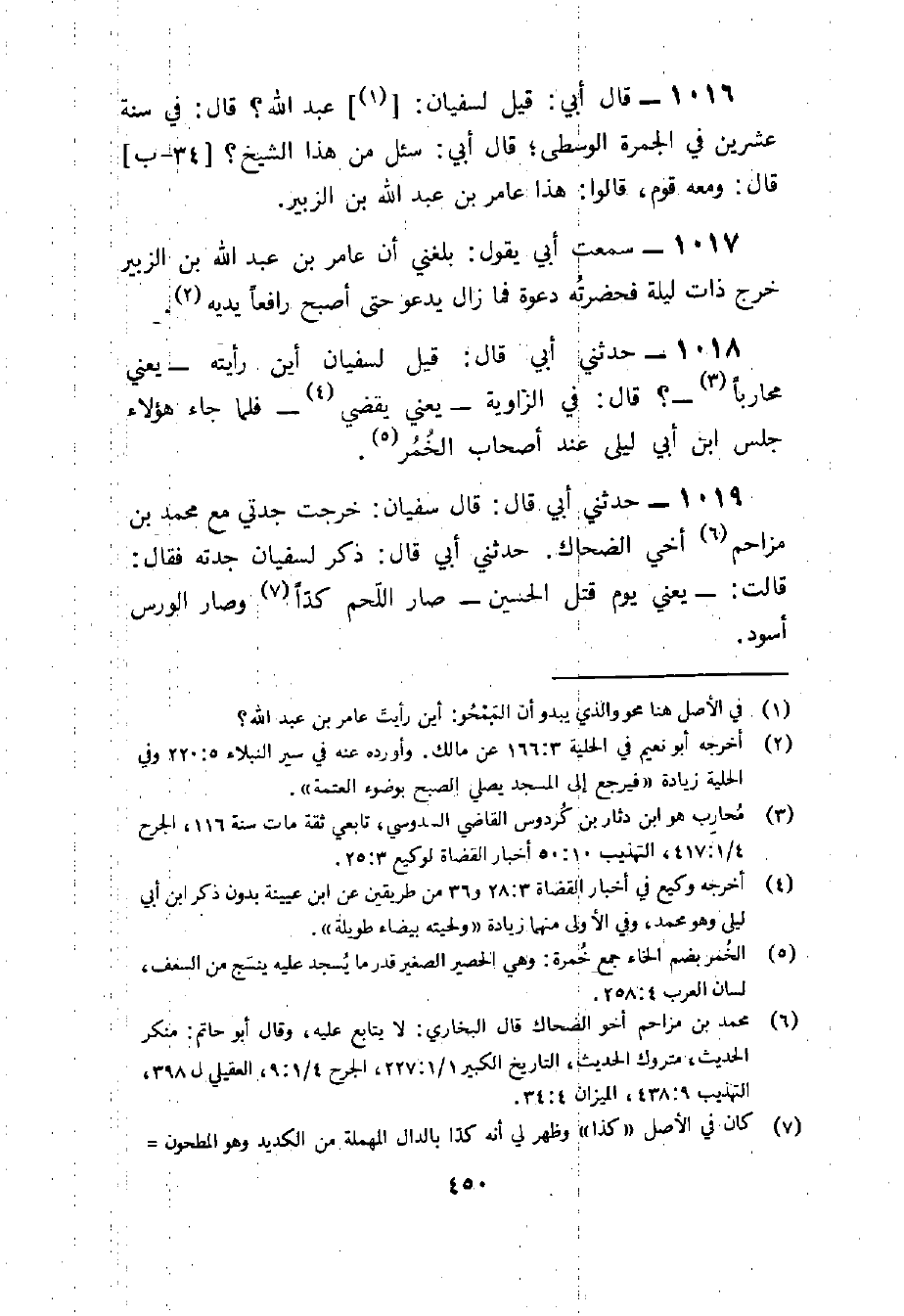 1016 - قَالَ أبي قيل لِسُفْيَان عبد الله قَالَ فِي سنة عشْرين فِي الْجَمْرَة الْوُسْطَى قَالَ أبي سُئِلَ من هَذَا الشَّيْخ قَالَ وَمَعَهُ قوم قَالُوا هَذَا عَامر بن عبد الله بن الزبير