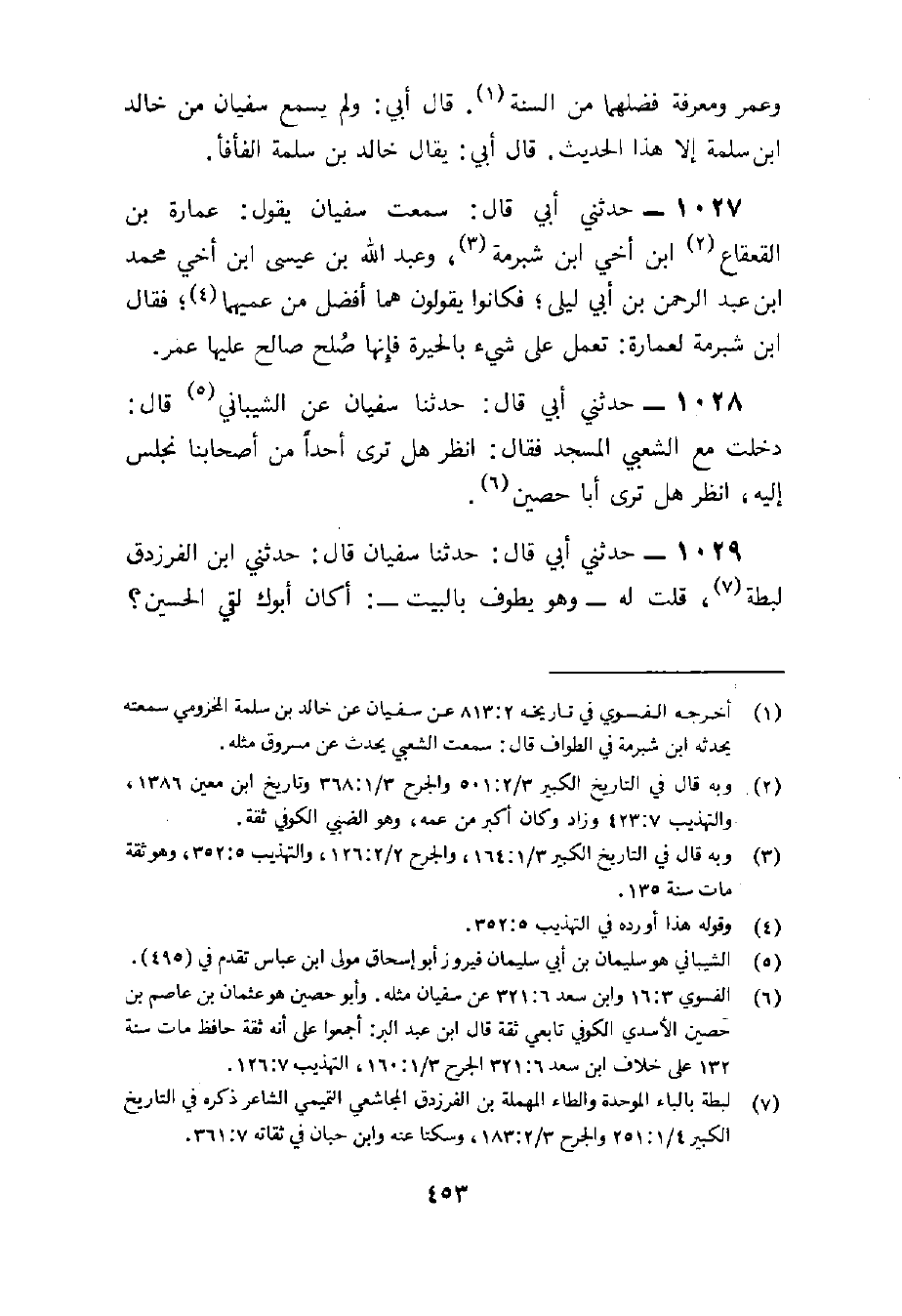 1028 - حَدثنِي أبي قَالَ حَدثنَا سُفْيَان عَن الشَّيْبَانِيّ قَالَ دخلت مَعَ الشّعبِيّ الْمَسْجِد فَقَالَ انْظُر هَل رى أحدا من أَصْحَابنَا نجلس إِلَيْهِ انْظُر هَل ترى أَبَا حُصَيْن