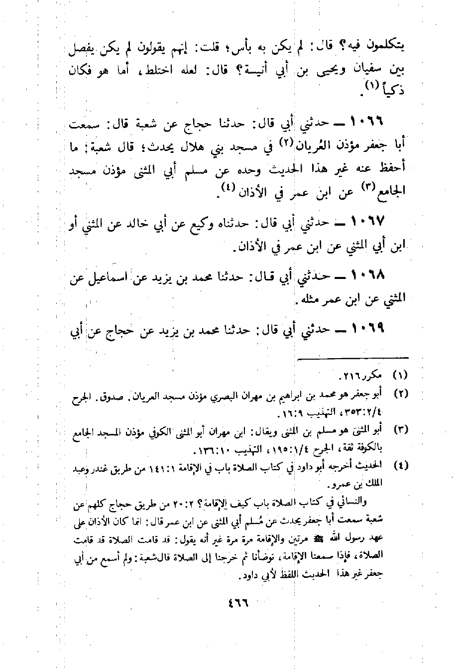 1066 - حَدثنِي أبي قَالَ حَدثنَا حجاج عَن شُعْبَة قَالَ سَمِعت أَبَا جَعْفَر مُؤذن الْعُرْيَان فِي مَسْجِد بني هِلَال يحدث قَالَ شُعْبَة مَا أحفظ عَنهُ غير هَذَا الحَدِيث وَحده عَن مُسلم أبي الْمثنى مُؤذن مَسْجِد الْجَامِع عَن بن عمر فِي الْأَذَان