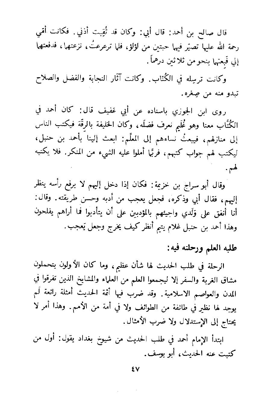 وقال: أنا أنفق على ولدي واجيئهم بالمؤدبين على أن يتأدبوا فما أراهم يفلحون وهذا أحمد بن حنبل غلام يتيم أنظر كيف يخرج وجعل يعجب.