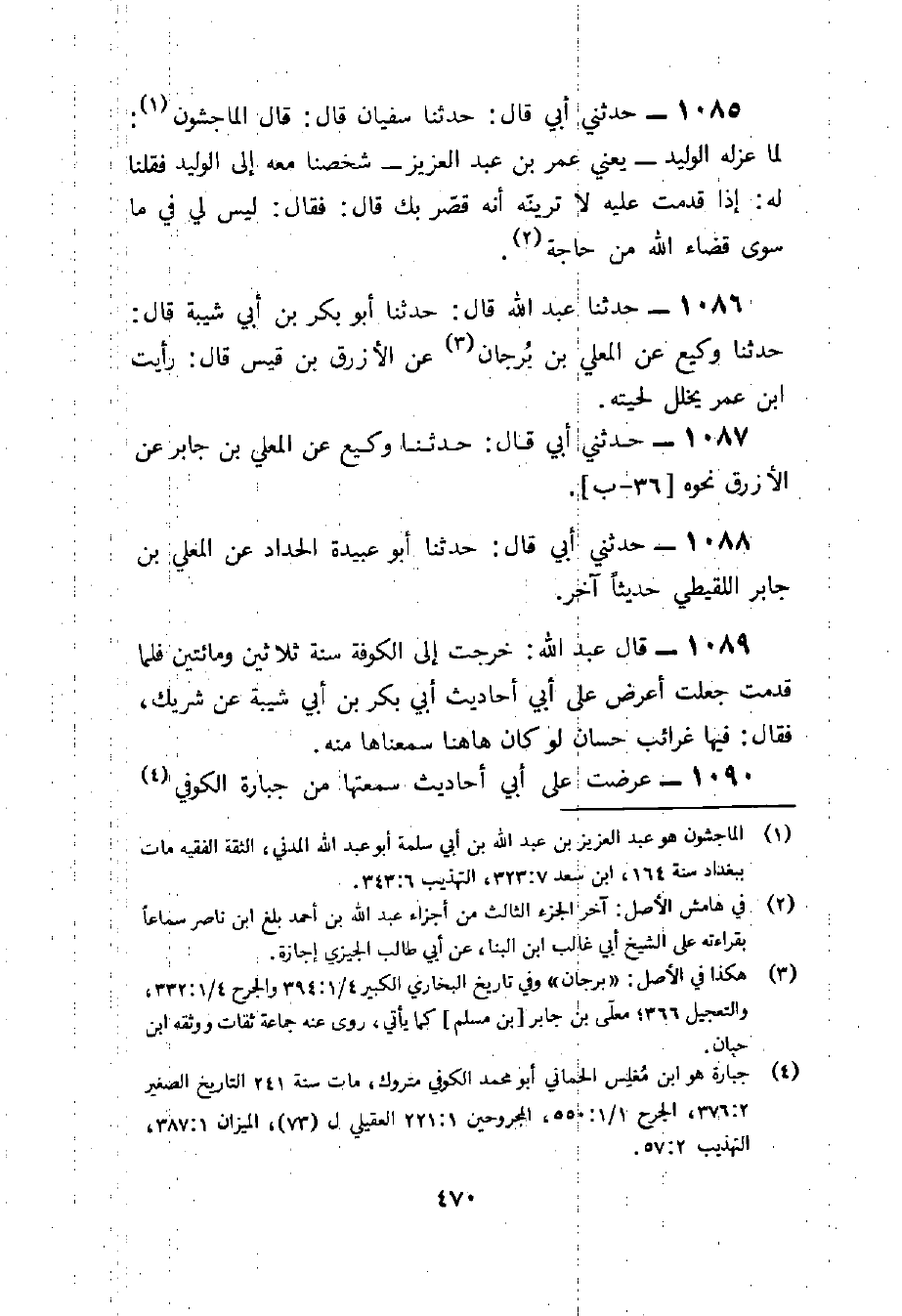 1090 - عَرَضْتُ عَلَى أَبِي أَحَادِيثَ سَمِعْتُهَا مِنْ جُبَارَةَ الْكُوفِيِّ فَقَالَ فِي بَعْضِهَا هِيَ مَوْضُوعَةٌ أَوْ هِيَ كَذِبٌ مِنْهَا عَنْ حَمَّادٍ الْأَبَحِّ عَنِ الزُّهْرِيِّ عَنْ سَعِيدِ بْنِ الْمُسَيِّبِ عَنْ أَبِي هُرَيْرَةَ عَنِ النَّبِيِّ صَلَّى اللَّهُ عَلَيْهِ وَسَلَّمَ تَعْمَلُ هَذِهِ الْأُمَّةُ بُرْهَةً بِكِتَابِ اللَّهِ ثُمَّ بُرْهَةً بِسُنَّةِ رَسُولِ اللَّهِ صَلَّى اللَّهُ عَلَيْهِ وَسَلَّمَ ثُمَّ بُرْهَةً بِالرَّأْيِ فَأَنْكَرَهُ جِدًّا وَعَنْ حَمَّادٍ الْأَبَحِّ عَنِ الْحَكَمِ عَنِ بن جُبَير عَن بن عَبَّاسٍ عَنِ النَّبِيِّ صَلَّى اللَّهُ عَلَيْهِ وَسَلَّمَ صَلَاةُ الْقَاعِدِ مِثْلُ نِصْفِ صَلَاةِ الْقَائِمِ فَأَنْكَرَهُ وَحَدِيثٌ عَن حَمَّاد بن زيد عَن إِسْحَاق بن سُوَيْد فأنكرها