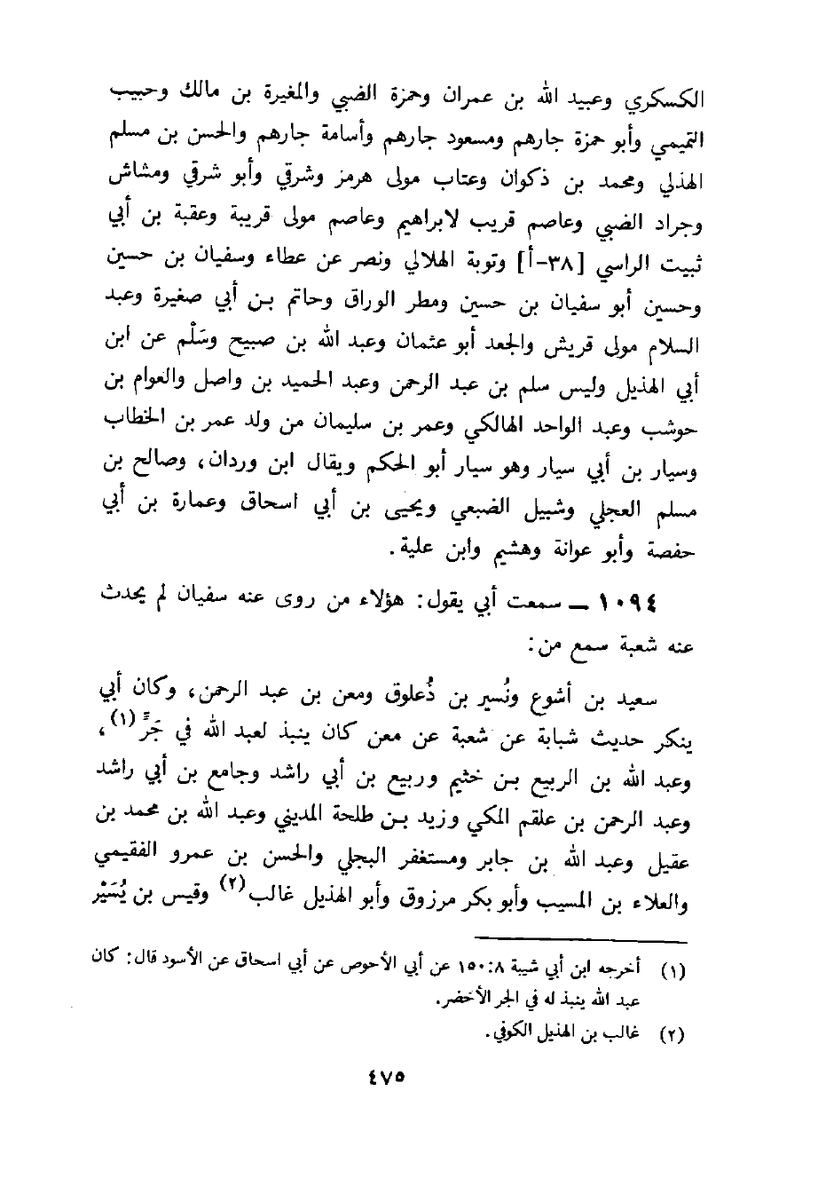 1094 - سَمِعت أبي يَقُول هَؤُلَاءِ من روى عَنهُ سُفْيَان لم يحدث عَنهُ شُعْبَة سمع من سعيد بن أَشوع ونسير بن ذعلوق ومعن بن عبد الرَّحْمَن وَكَانَ أبي يُنكر حَدِيث شَبابَة عَن شُعْبَة عَن معن كَانَ ينْبذ لعبد الله فِي جر وَعبد الله بن الرّبيع بن خثيم وربيع بن أبي رَاشد وجامع بن أبي رَاشد وَعبد الرَّحْمَن بن علقم الْمَكِّيّ وَزيد بن طَلْحَة الْمَدِينِيّ وَعبد الله بن مُحَمَّد بن عقيل وَعبد الله بن جَابر ومستغفر البَجلِيّ وَالْحسن بن عَمْرو الْفُقيْمِي والْعَلَاء بن الْمسيب وَأَبُو بكر مَرْزُوق وَأَبُو الْهُذيْل غَالب وَقيس بن يسير