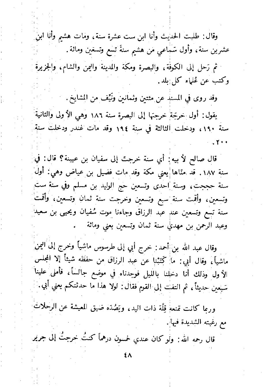 قد مناها يعني مكة وقد مات فضيل بن عياض وهي: أول سنة حججت، وسنة احدى وتسعين حج الوليد بن مسلم وفي سنة ست وتسعين، وأقمت سنة سبع وتسعين وخرجت سنة ثمان وتسعين، وأقمت سنة تسع وتسعين عند عبد الرزاق وجاءنا موت سفيان ويحيى بن سعيد وعبد الرحمن بن مهدي سنة ثمان وتسعين يعني ومائة.