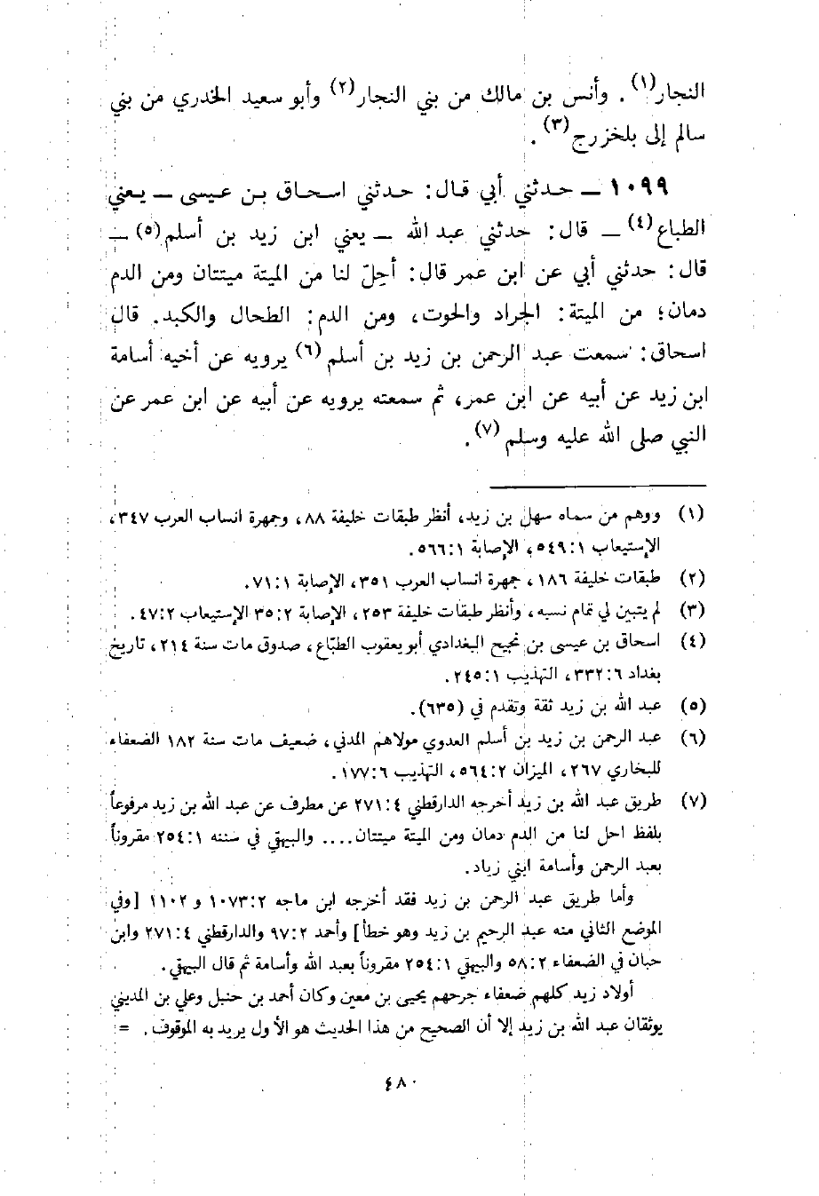 1099 - حَدَّثَنِي أَبِي قَالَ حَدَّثَنِي إِسْحَاقُ بْنُ عِيسَى يَعْنِي الطَّبَّاعَ قَالَ حَدثنِي عبد الله يَعْنِي بن زَيْدِ بْنَ أَسْلَمَ قَالَ حَدَّثَنِي أبي عَن بن عُمَرَ قَالَ أُحِلَّ لَنَا مِنَ الْمَيْتَةِ مَيْتَتَانِ وَمِنَ الدَّمِ دَمَانِ مِنَ الْمَيْتَةِ الْجَرَادُ وَالْحُوتُ وَمِنَ الدَّمِ الطِّحَالُ وَالْكَبِدُ قَالَ إِسْحَاق سَمِعت عبد الرَّحْمَن بن زيد بن أسلم يرويهِ عَن أَخِيه أُسَامَة بن زيد عَن أَبِيه عَن بن عمر ثمَّ سمعته يرويهِ عَن أَبِيه عَن بن عُمَرَ عَنِ النَّبِيِّ صَلَّى اللَّهُ عَلَيْهِ وَسَلَّمَ