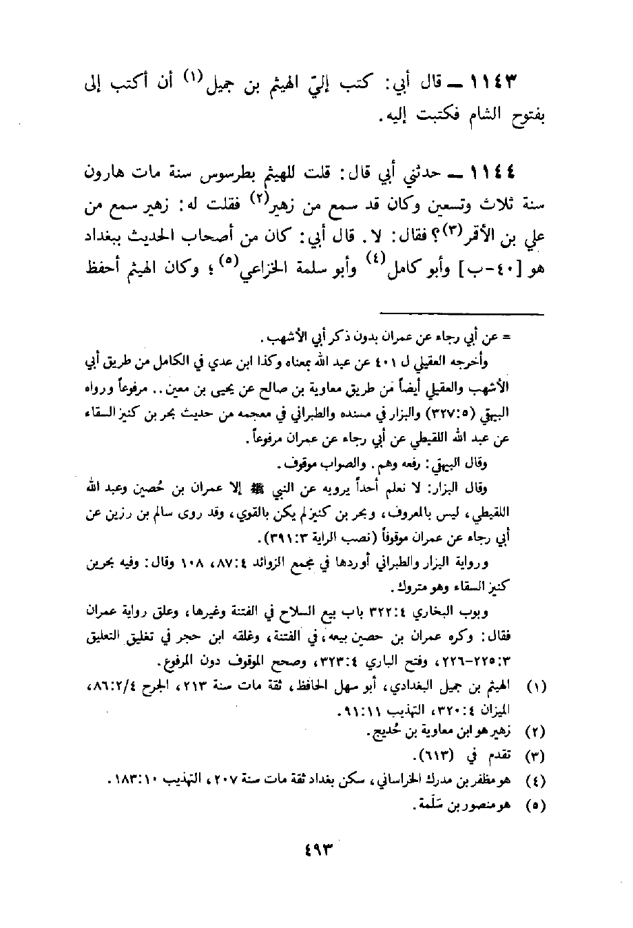 1144 - حَدثنِي أبي قَالَ قلت للهيثم بطرسوس سنة مَاتَ هَارُون سنة ثَلَاث وَتِسْعين وَكَانَ قد سمع من زُهَيْر فَقلت لَهُ زُهَيْر سمع من عَليّ بن الْأَقْمَر فَقَالَ لَا قَالَ أبي كَانَ من أَصْحَاب الحَدِيث بِبَغْدَاد هُوَ وَأَبُو كَامِل وَأَبُو سَلمَة الْخُزَاعِيّ وَكَانَ الْهَيْثَم أحفظ الثَّلَاثَة وَكَانَ أَبُو كَامِل أتقن للْحَدِيث مِنْهُ