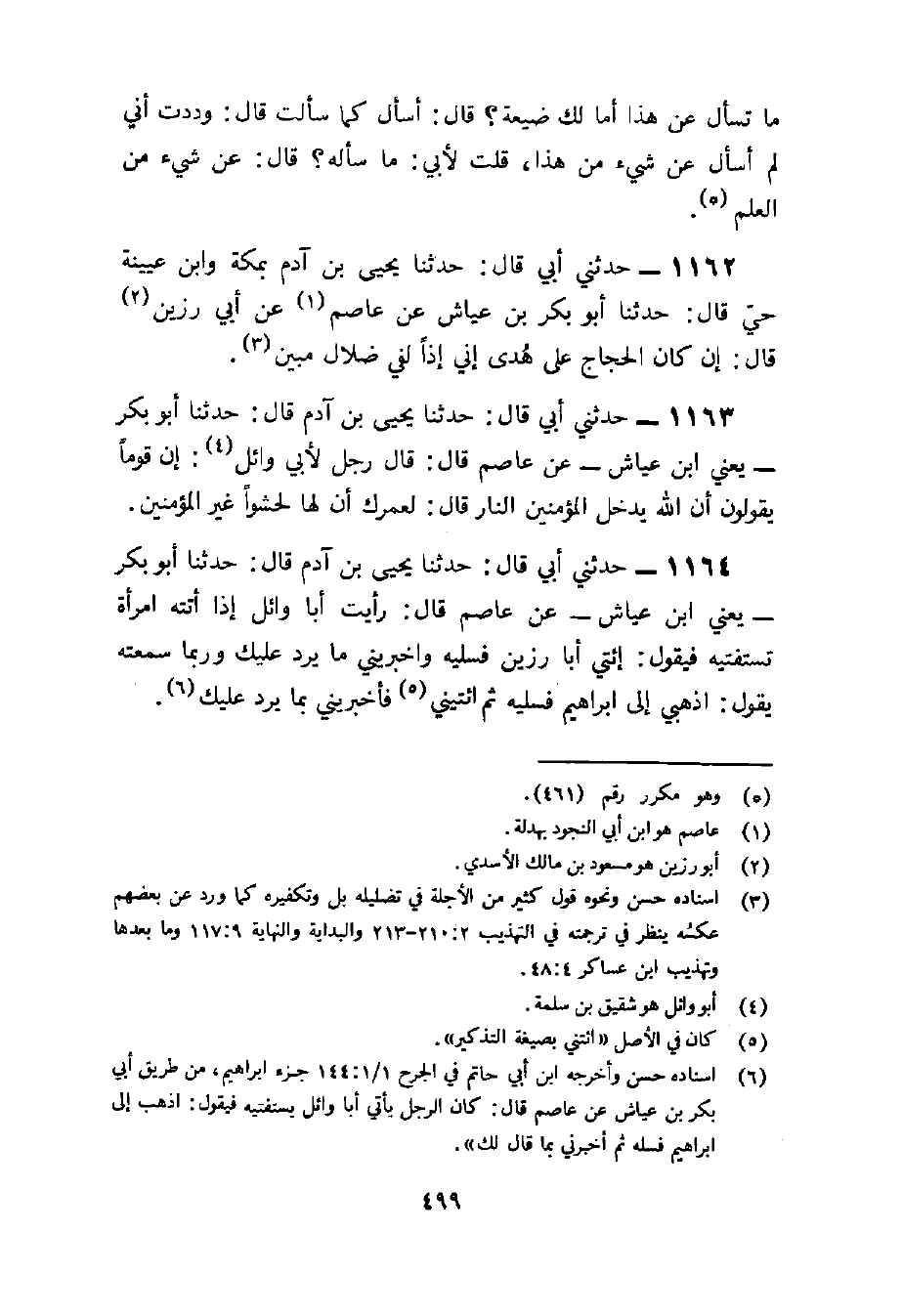 1164 - حَدثنِي أبي قَالَ حَدثنَا يحيى بن آدم قَالَ حَدثنَا أَبُو بكر يَعْنِي بن عَيَّاش عَن عَاصِم قَالَ رَأَيْت أَبَا وَائِل إِذا أَتَتْهُ امْرَأَة تستفتيه فَيَقُول ائتي أَبَا رزين فسليه وأخبريني مَا يرد عَلَيْك وَرُبمَا سمعته يَقُول اذهبي إِلَى إِبْرَاهِيم فسليه ثمَّ ائْتِينِي فاخبريني بِمَا يرد عَلَيْك