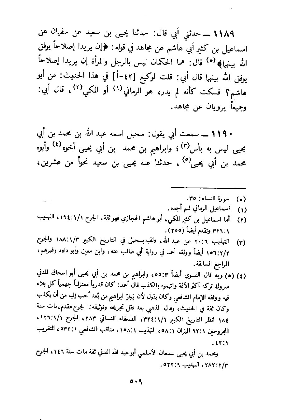 1189 - حَدثنِي أبي قَالَ حَدثنَا يحيى بن سعيد عَن سُفْيَان عَن إِسْمَاعِيل بن كثير أبي هَاشم عَن مُجَاهِد فِي قَوْله إِنْ يُرِيدَا إِصْلاحًا يُوَفِّقِ اللَّهُ بَينهمَا قَالَ هما الحكمان لَيْسَ بِالرجلِ وَالْمَرْأَة إِنْ يُرِيدَا إِصْلاحًا يُوَفِّقِ الله بَينهمَا قَالَ أبي قلت لوكيع فِي هَذَا الحَدِيث من أَبُو هَاشم فَسكت كَأَنَّهُ لم يدر هُوَ الرماني أَو الْمَكِّيّ قَالَ أبي وجميعا يرويان عَن مُجَاهِد