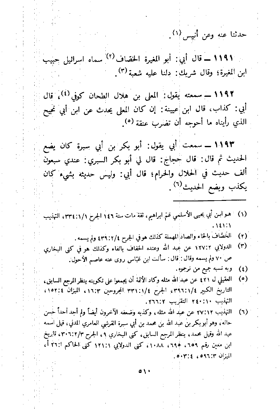 1193 - سَمِعت أبي يَقُول أَبُو بكر بن أبي سُبْرَة كَانَ يضع الحَدِيث ثمَّ قَالَ قَالَ حجاج قَالَ لي أَبُو بكر السبري عِنْدِي سَبْعُونَ ألف حَدِيث فِي الْحَلَال وَالْحرَام قَالَ أبي وَلَيْسَ حَدِيثه بِشَيْء كَانَ يكذب وَيَضَع الحَدِيث