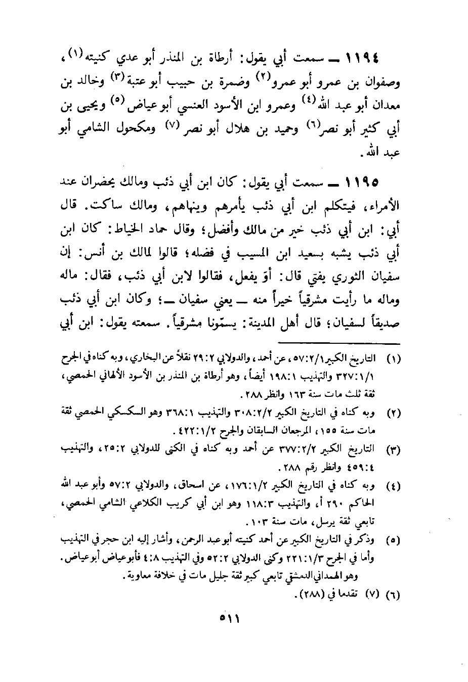 1195 - سَمِعت أبي يَقُول كَانَ بن أبي ذِئْب وَمَالك يحْضرَانِ عِنْد الْأُمَرَاء فيتكلم بن أبي ذِئْب يَأْمُرهُم وينهاهم وَمَالك سَاكِت قَالَ أبي بن أبي ذِئْب خير من مَالك وَأفضل وَقَالَ حَمَّاد الْخياط كَانَ بن أبي ذِئْب يشبه بِسَعِيد بن الْمسيب فِي فَضله قَالُوا لمَالِك بن أنس إِن سُفْيَان الثَّوْريّ يُفْتِي قَالَ أَو يفعل فَقَالُوا لِابْنِ أبي ذِئْب فَقَالَ مَاله وَمَاله مَا رَأَيْت مشرقيا خيرا مِنْهُ يَعْنِي سُفْيَان وَكَانَ بن أبي ذِئْب صديقا لِسُفْيَان قَالَ أهل الْمَدِينَة يسمونا مشرقيا سمعته يَقُول بن أبي ذِئْب اسْمه مُحَمَّد بن عبد الرَّحْمَن بن الْمُغيرَة بن أبي ذِئْب وَكَانَ قوالا بِالْحَقِّ قلت كَيفَ سَماع من سمع مِنْهُ قَالَ كَانَ لَا يملي عَلَيْهِم إِنَّمَا كَانُوا يتحفظون فَمن حفظ حفظ إِلَّا أَن حجاجا قَالَ سَمِعت من بن أبي ذِئْب ثمَّ عرضتها عَلَيْهِ