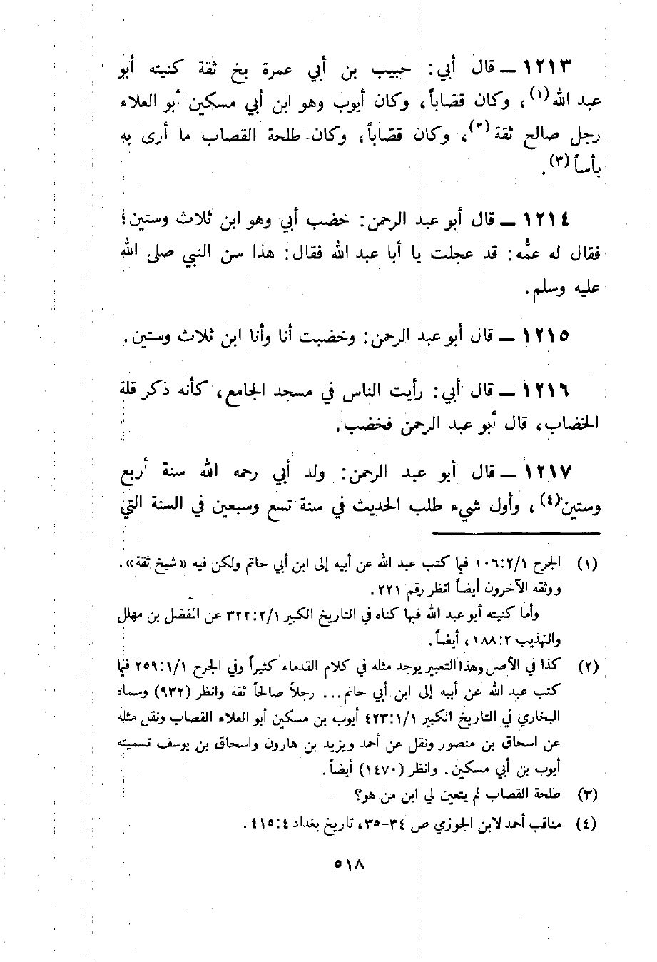 1213 - قَالَ أبي حبيب بن أبي عمْرَة بخ ثِقَة كنيته أَبُو عبد الله وَكَانَ قصابا وَكَانَ أَيُّوب وَهُوَ بن أبي مِسْكين أَبُو الْعَلَاء رجل صَالح ثِقَة وَكَانَ قصابا وَكَانَ طَلْحَة القصاب مَا أرى بِهِ بَأْسا