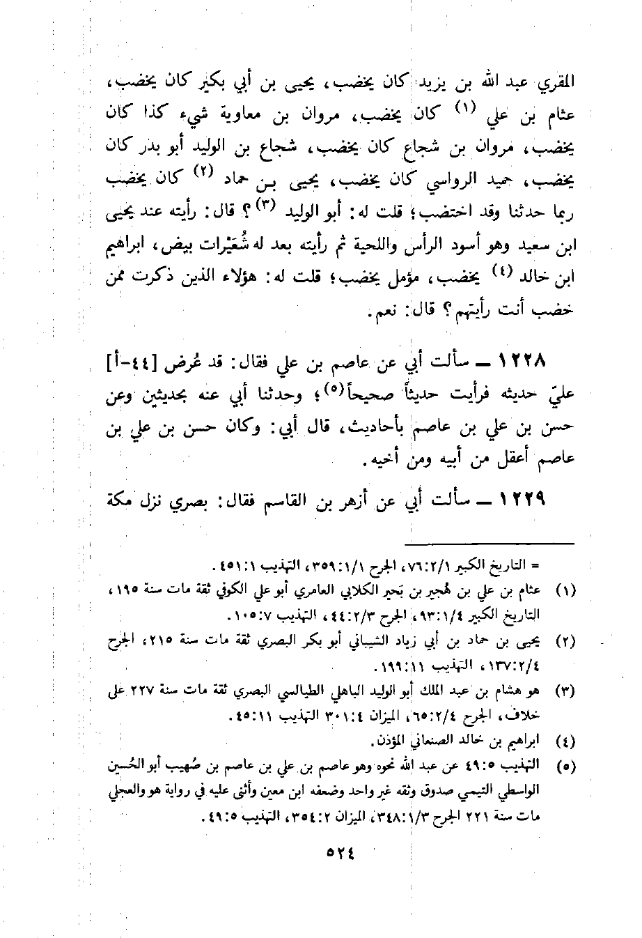 1229 - سَأَلت أبي عَن أَزْهَر بن الْقَاسِم فَقَالَ بَصرِي نزل مَكَّة وَكَانَ يَبِيع الشطوي فَكنت أَنا وَأَبُو مُسلم نَخْتَلِف إِلَيْهِ ثمَّ قَالَ مَا أقل من كتب عَنهُ غَيرنَا ثمَّ قَالَ سَأَلت عبد الصَّمد بن عبد الْوَارِث عَنهُ فَعرفهُ وَقَالَ عبد الصَّمد كتبت عَن جده أَو جد لأزهر