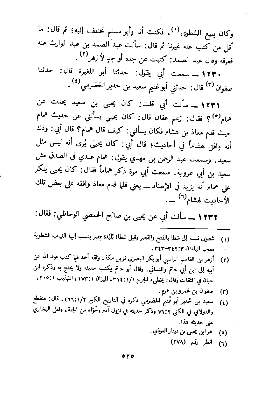 1231 - سَأَلت أبي قلت كَانَ يحيى بن سعيد يحدث عَن همام فَقَالَ زعم عَفَّان قَالَ كَانَ يحيى يسألني عَن حَدِيث همام حَيْثُ قدم معَاذ بن هِشَام فَكَانَ يسألني كَيفَ قَالَ همام قَالَ أبي وذك أَنه وَافق هشاما فِي أَحَادِيث قَالَ أبي كَانَ يحيى يرى أَنه لَيْسَ مثل سعيد وَسمعت عبد الرَّحْمَن بن مهْدي يَقُول همام عِنْدِي فِي الصدْق مثل سعيد بن أبي عرُوبَة سَمِعت أبي مرّة ذكر هماما فَقَالَ كَانَ يحيى يُنكر على همام أَنه يزِيد فِي الْإِسْنَاد يَعْنِي فَلَمَّا قدم معَاذ وَافقه على بعض تِلْكَ الْأَحَادِيث لهشام
