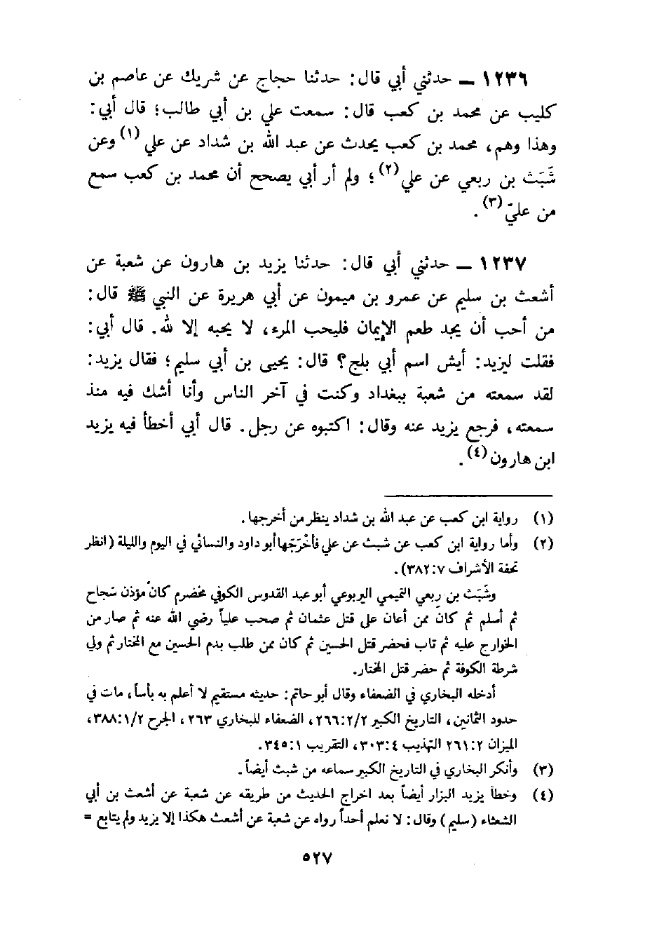 1236 - حَدثنِي أبي قَالَ حَدثنَا حجاج عَن شريك عَن عَاصِم بن كُلَيْب عَن مُحَمَّد بن كَعْب قَالَ سَمِعت عَليّ بن أبي طَالب قَالَ أبي وَهَذَا وهم مُحَمَّد بن كَعْب يحدث عَنْ عَبْدِ اللَّهِ بْنِ شَدَّادٍ عَن عَليّ وَعَن شبث بن ربعي عَن عَليّ وَلم أر أبي يصحح أَن مُحَمَّد بن كَعْب سمع من عَليّ