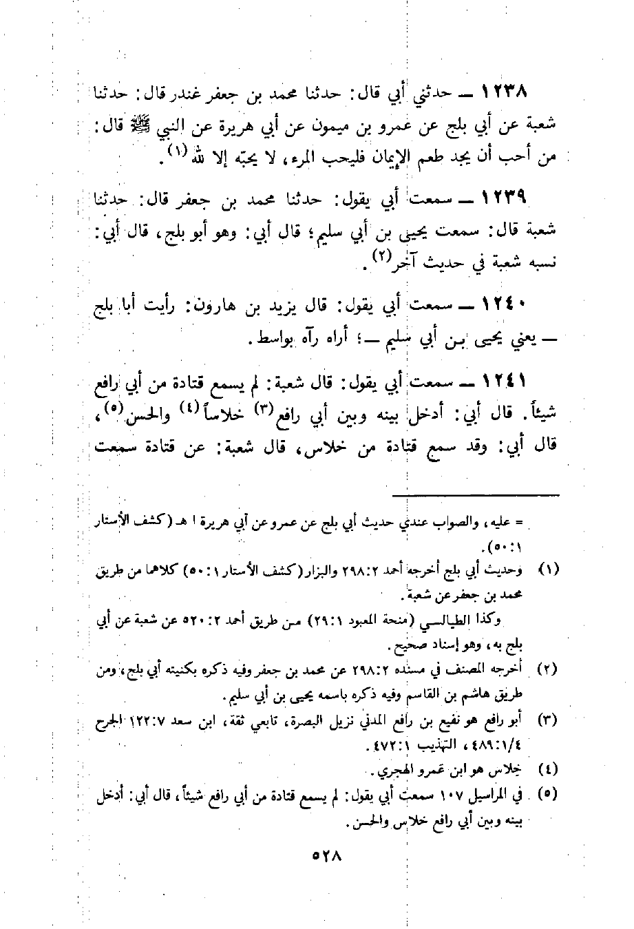 1238 - حَدثنِي أبي قَالَ حَدثنَا مُحَمَّدُ بْنُ جَعْفَرٍ غُنْدَرٌ قَالَ حَدَّثَنَا شُعْبَةُ عَنْ أَبِي بَلْجٍ عَنْ عَمْرِو بْنِ مَيْمُونٍ عَنْ أَبِي هُرَيْرَةَ عَنِ النَّبِيِّ صَلَّى اللَّهُ عَلَيْهِ وَسَلَّمَ قَالَ مَنْ أَحَبَّ أَنْ يَجِدَ طَعْمَ الْإِيمَانِ فَلْيُحِبَّ الْمَرْءَ لَا يُحِبُّهُ إِلَّا لِلَّهِ