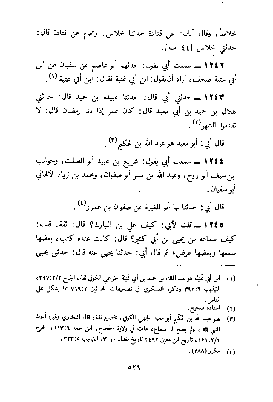 1245 - قلت لأبي كَيفَ عَليّ بن الْمُبَارك قَالَ ثِقَة قلت كَيفَ سَمَاعه من يحيى بن أبي كثير قَالَ كَانَت عِنْده كتب بَعْضهَا سَمعهَا وَبَعضهَا عرض ثمَّ قَالَ أبي حَدثنَا يحيى عَنهُ قَالَ حَدثنِي يحيى بن أبي كثير ثمَّ قَالَ قَالَ عَليّ بن الْمُبَارك جَاءَنِي يحيى بن سعيد جَاءَنِي يحيى بن سعيد قَالَ أبي مَا رَأَيْت أحدا أروى عَنهُ من وَكِيع