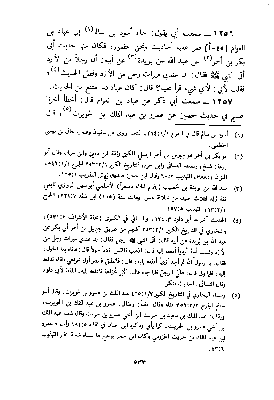 1256 - سَمِعْتُ أَبِي يَقُولُ جَاءَ أَسْوَدُ بْنُ سَالِمٍ إِلَى عَبَّادِ بْنِ الْعَوَّامِ فَقَرَأَ عَلَيْهِ أَحَادِيثَ وَنَحْنُ حُضُورٌ فَكَانَ مِنْهَا حَدِيثُ أَبِي بَكْرِ بْنِ أَحْمَرَ عَنْ عَبْدِ اللَّهِ بْنِ بُرَيْدَةَ عَنْ أَبِيهِ أَنَّ رَجُلا مِنَ الأَزْدِ أَتَى النَّبِيَّ صَلَّى اللَّهُ عَلَيْهِ وَسَلَّمَ فَقَالَ إِنَّ عِنْدِي مِيرَاثَ رَجُلٍ مِنَ الأَزْدِ وَقَصَّ الْحَدِيثَ فَقُلْتُ لأَبِي لأَيِّ شَيْءٍ قَرَأَ عَلَيْهِ قَالَ كَانَ عَبَّادٌ قَدِ امْتَنَعَ مِنَ الْحَدِيثِ
